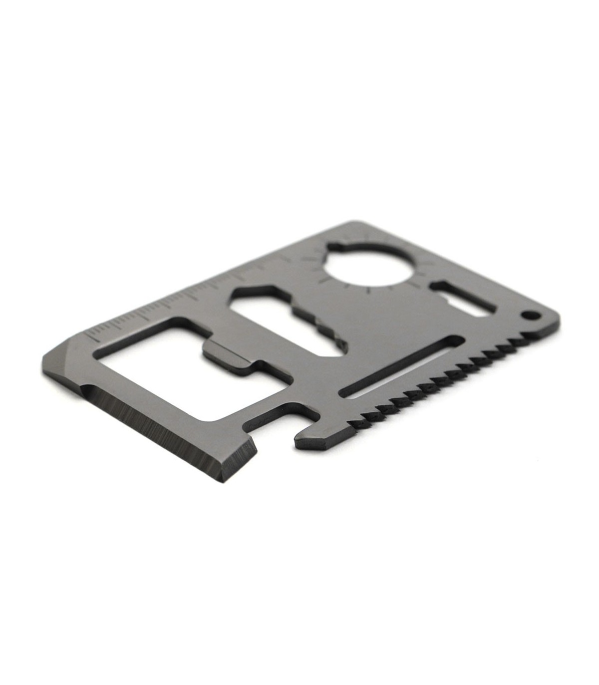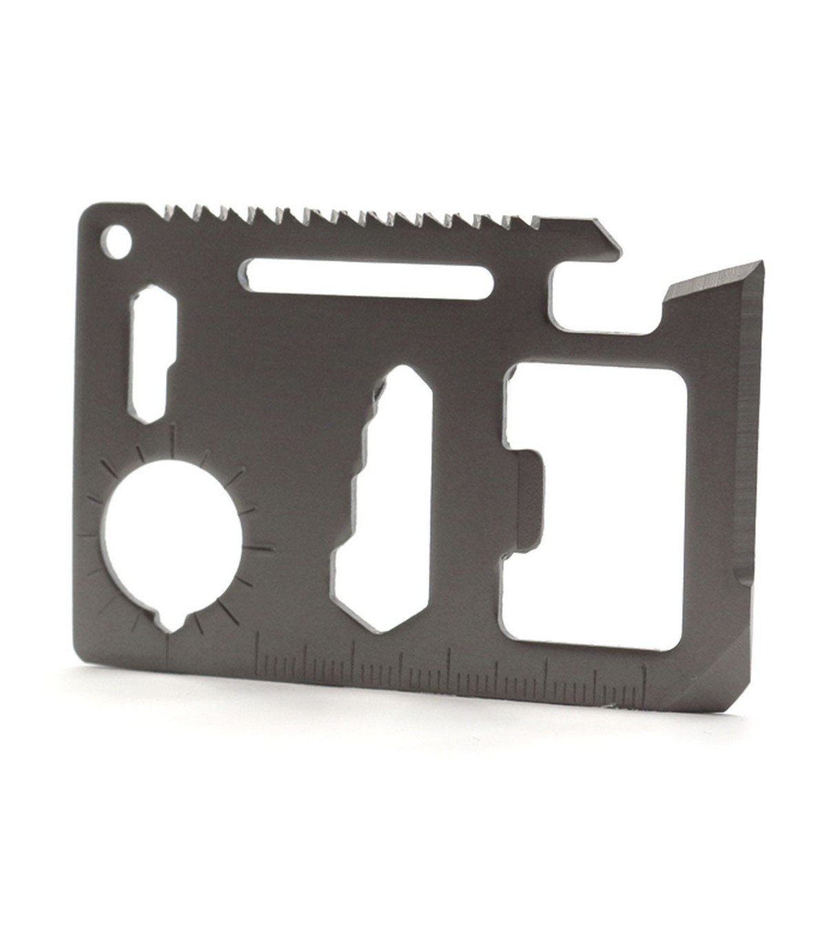 Multiherramienta en acero inox con 11 funciones. Con funciones abrelatas, cuchillo, destornillador, regla, abrebotellas, llaves inglesas, llaves de mariposas, sierra e indicador de dirección.