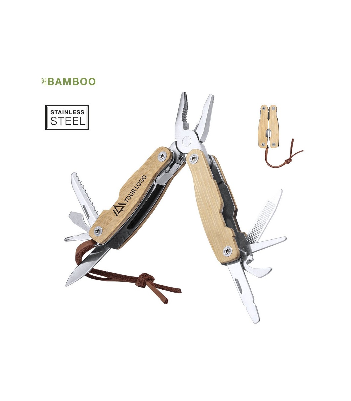 Multiherramienta con resistente cuerpo en acero inox y empuñadura de bambú, con 12 funciones. Incluye cuchillos y navajas, destornilladores, limas, abridores y alicates. Con cinta para transporte en polipiel y presentada en caja individual.