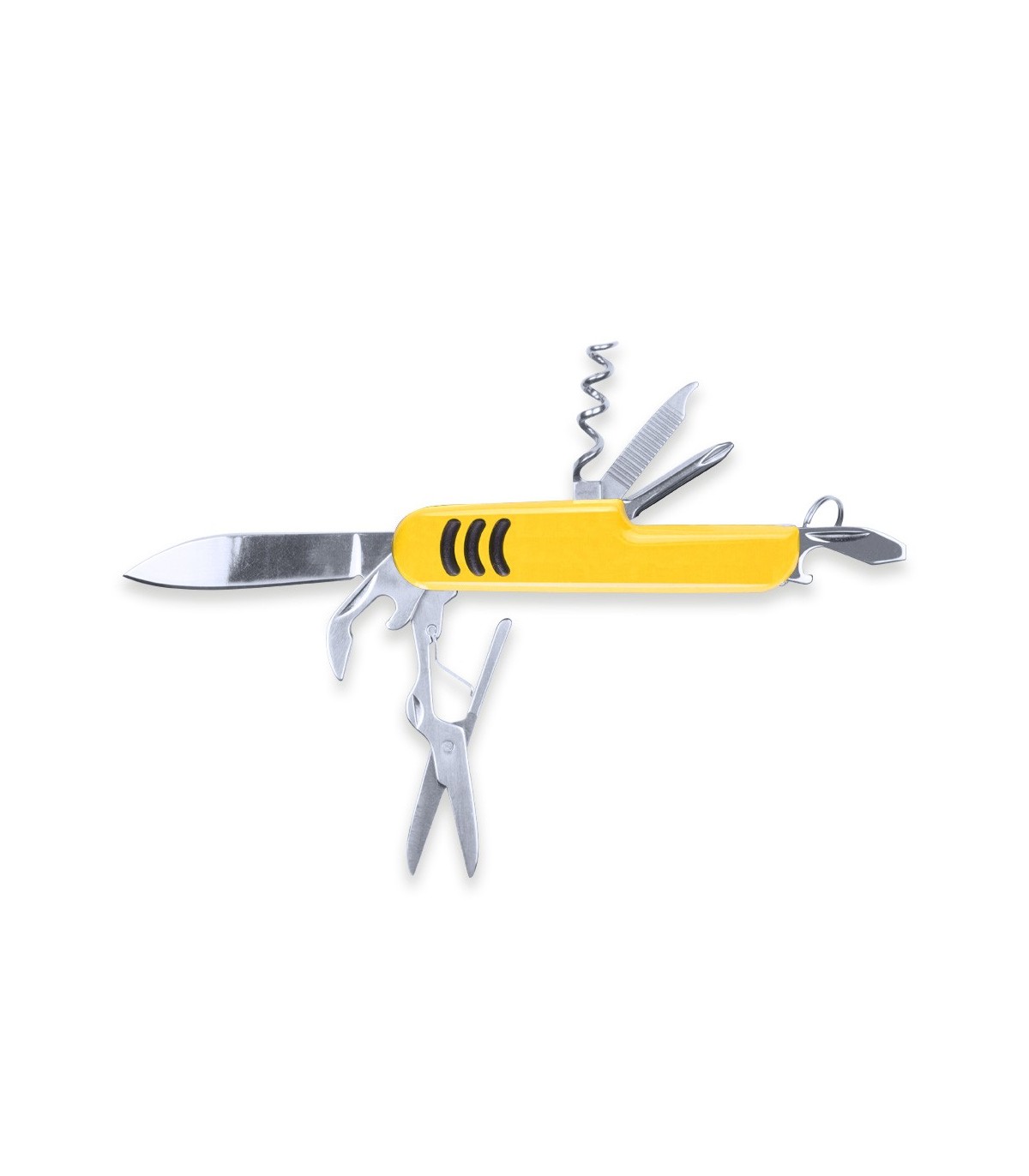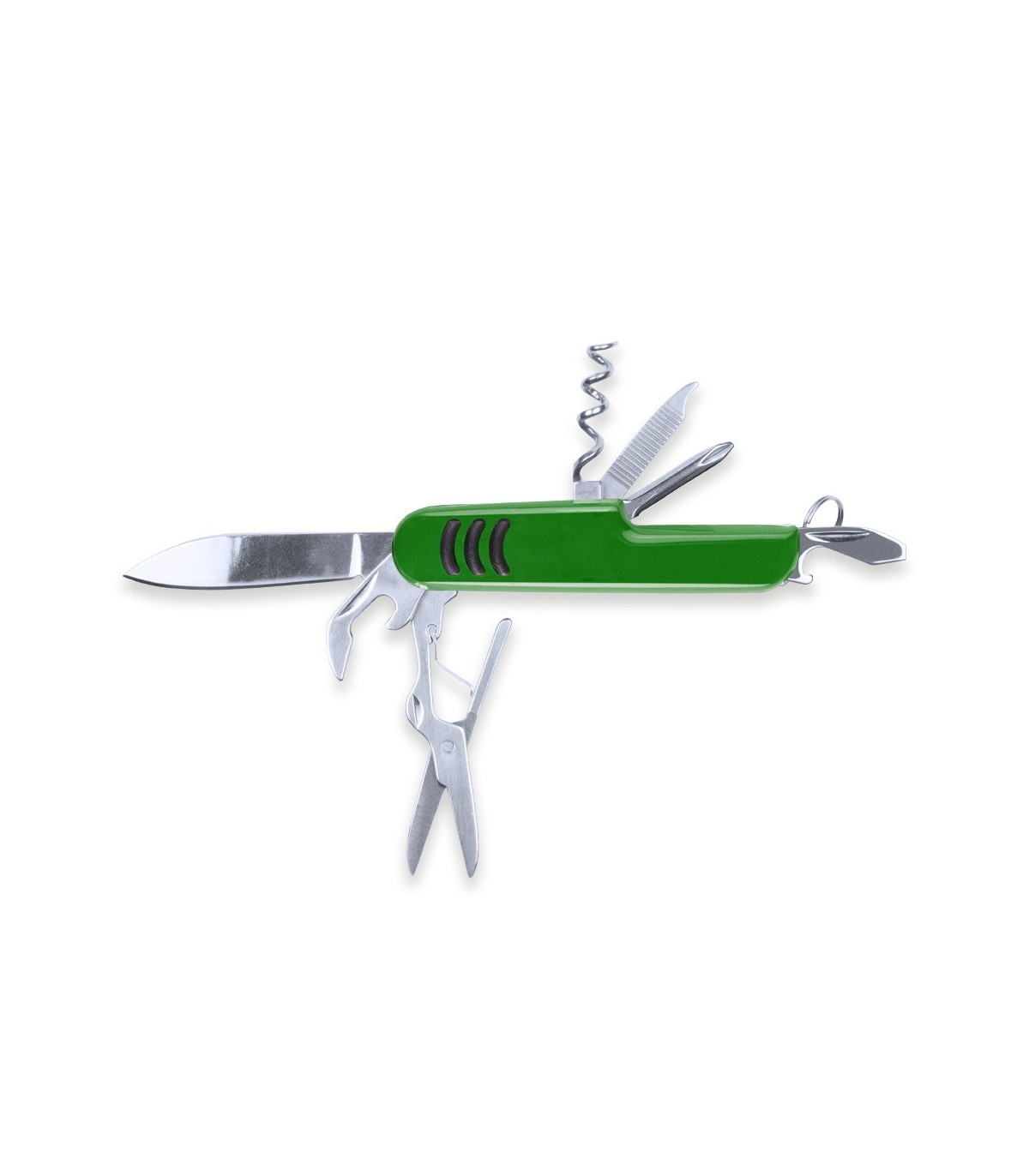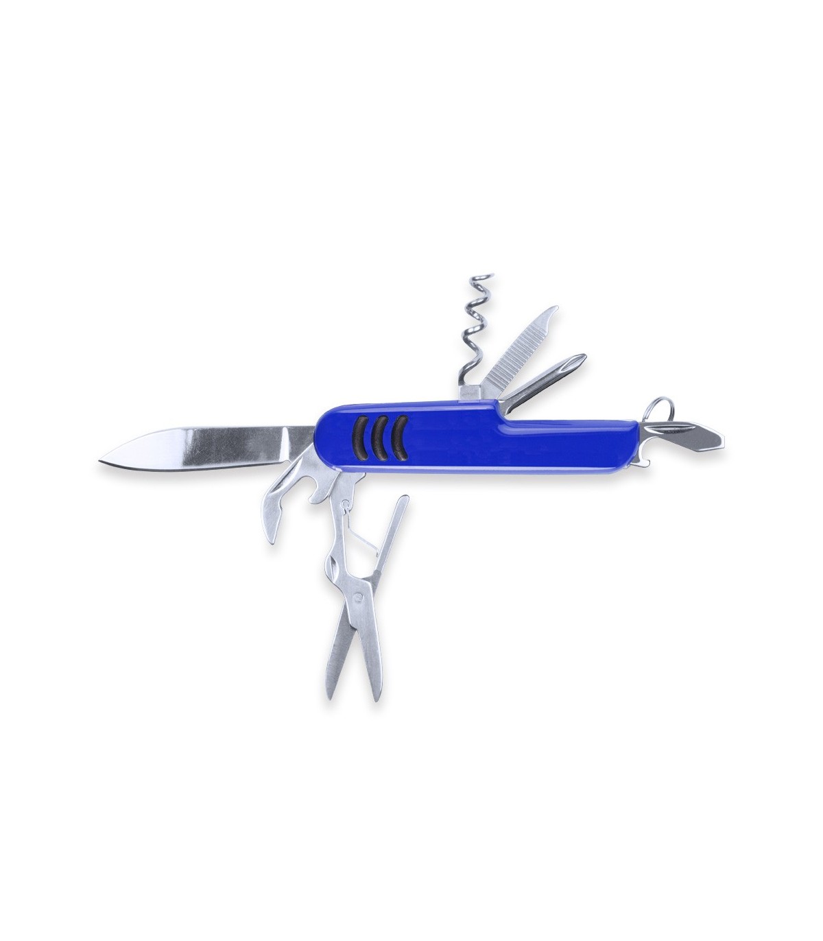 Navaja personalizadas con logo función multiusos con accesorios de acero inox de 9 funciones y mango con accesorio antideslizante en vivos colores.