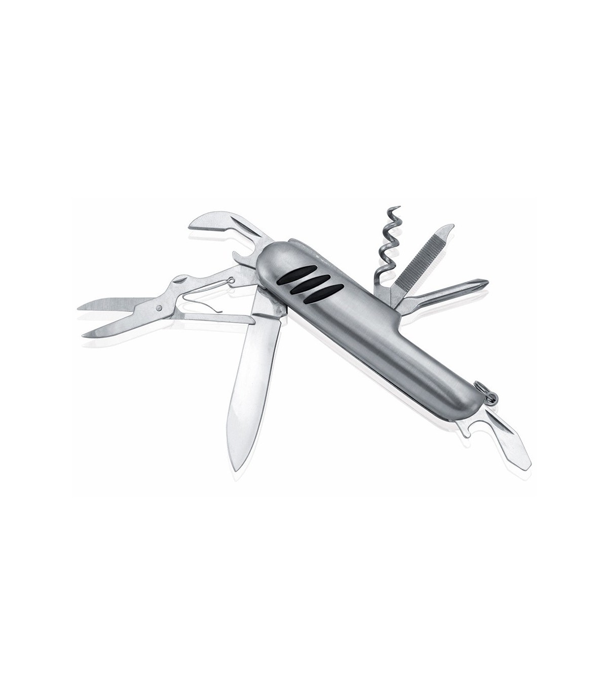 Navaja multiusos de acero inox de 10 funciones con empuñadura antideslizante. Incluye navaja, abridores, destornillador, lima, tijeras y anilla para llavero. Presentada en caja individual.