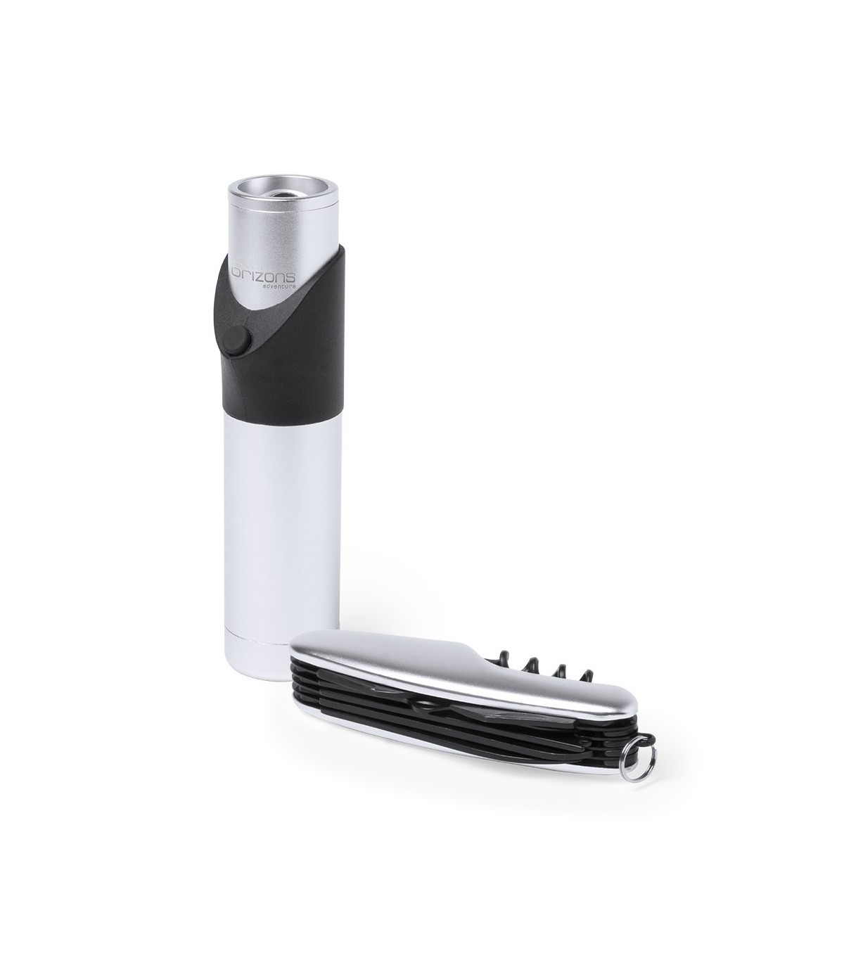 Set de Orizons de navaja multiusos y linterna presentado en estuche individual con cierre magnético e interior troquelado en suave espuma. Linterna led de aluminio con 3 modos de iluminación y alimentada a pilas: 3xAAA no incluidas. Navaja multiusos de acero inox con 15 accesorios en color negro.