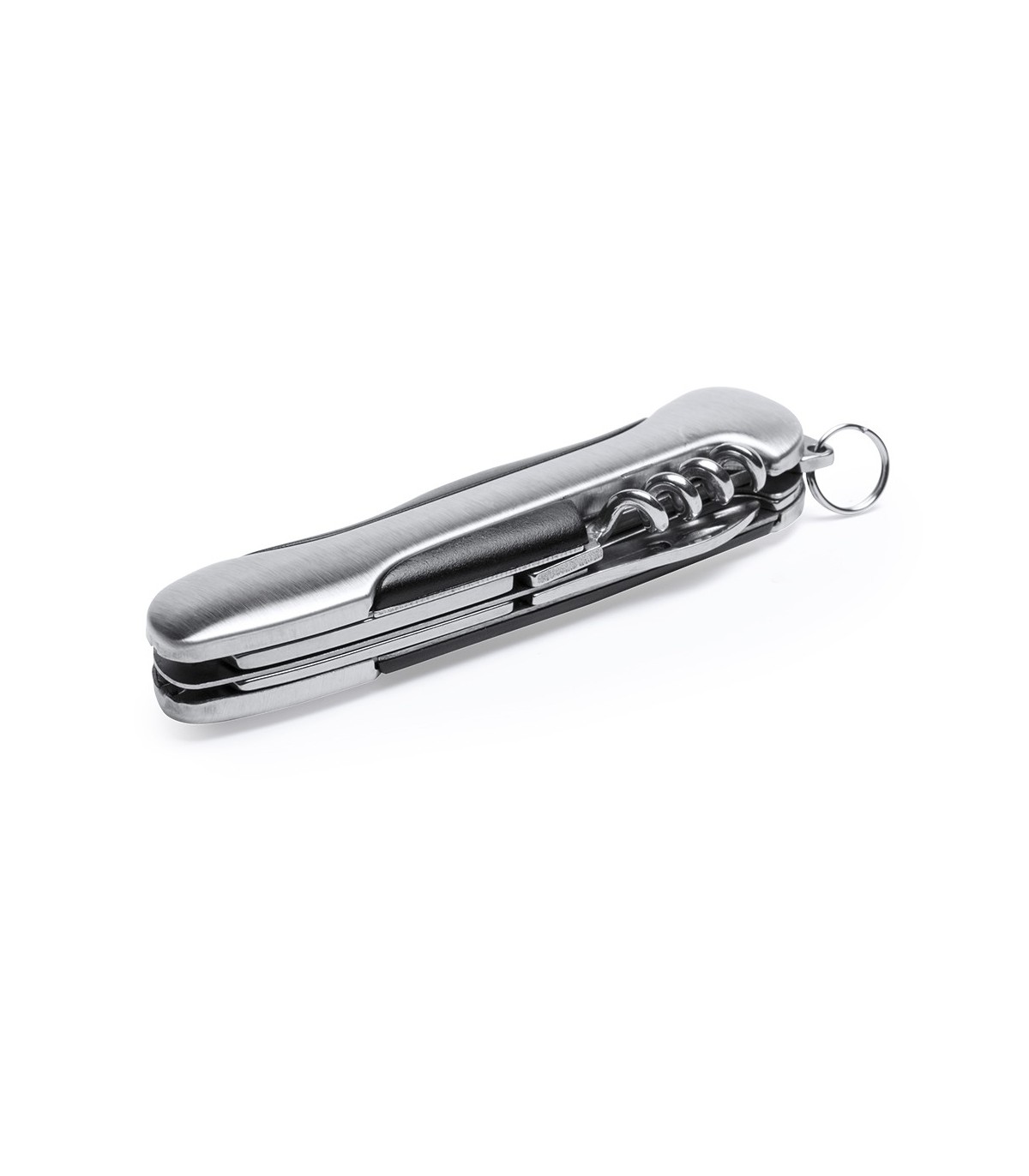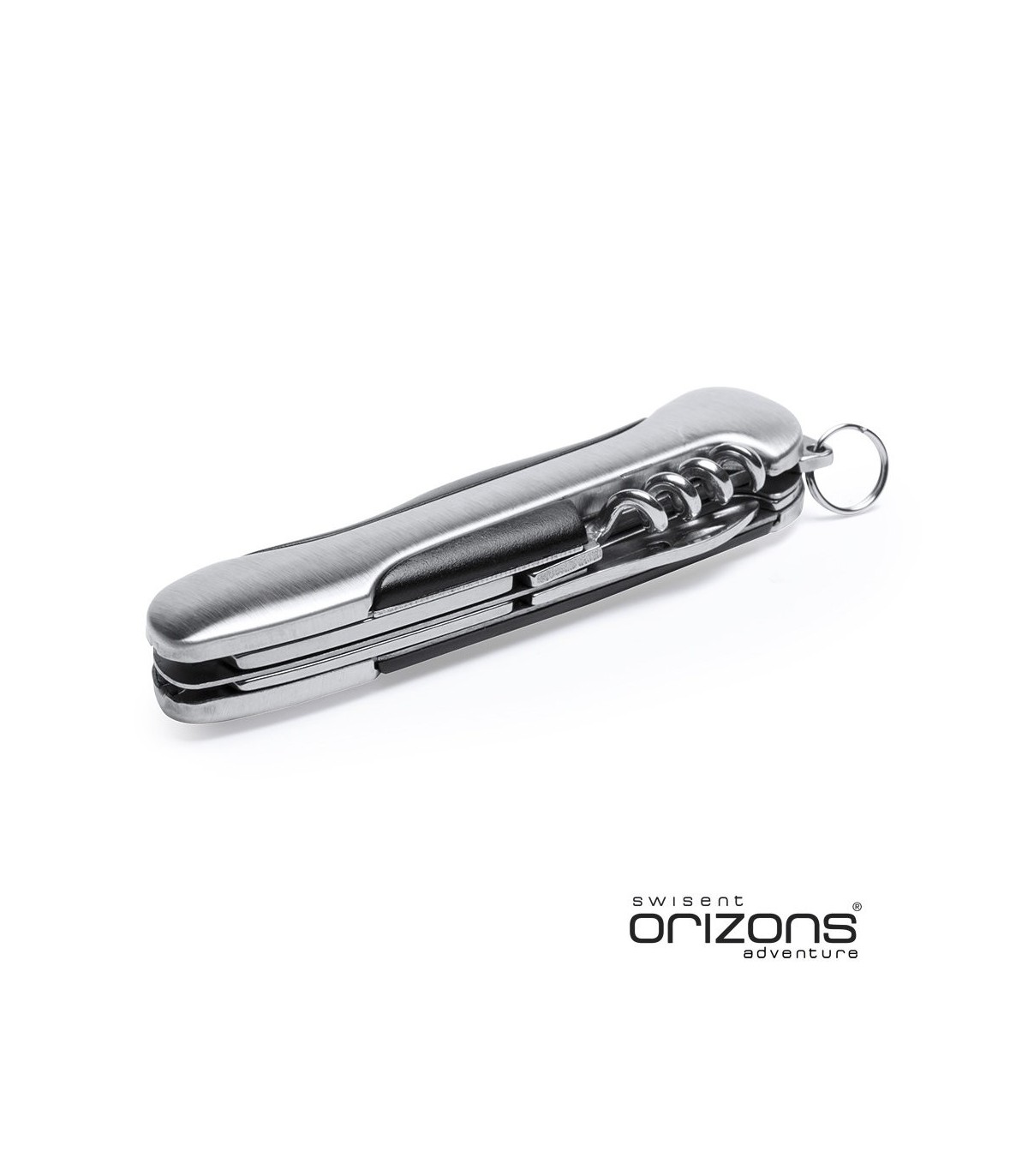 Navaja multiusos publicitarias de Orizons en acero inox de 8 funciones y mango antideslizante, abrelatas, abrebotellas, destornilladores, punzón con lima y sacacorchos. Con anilla para llavero.