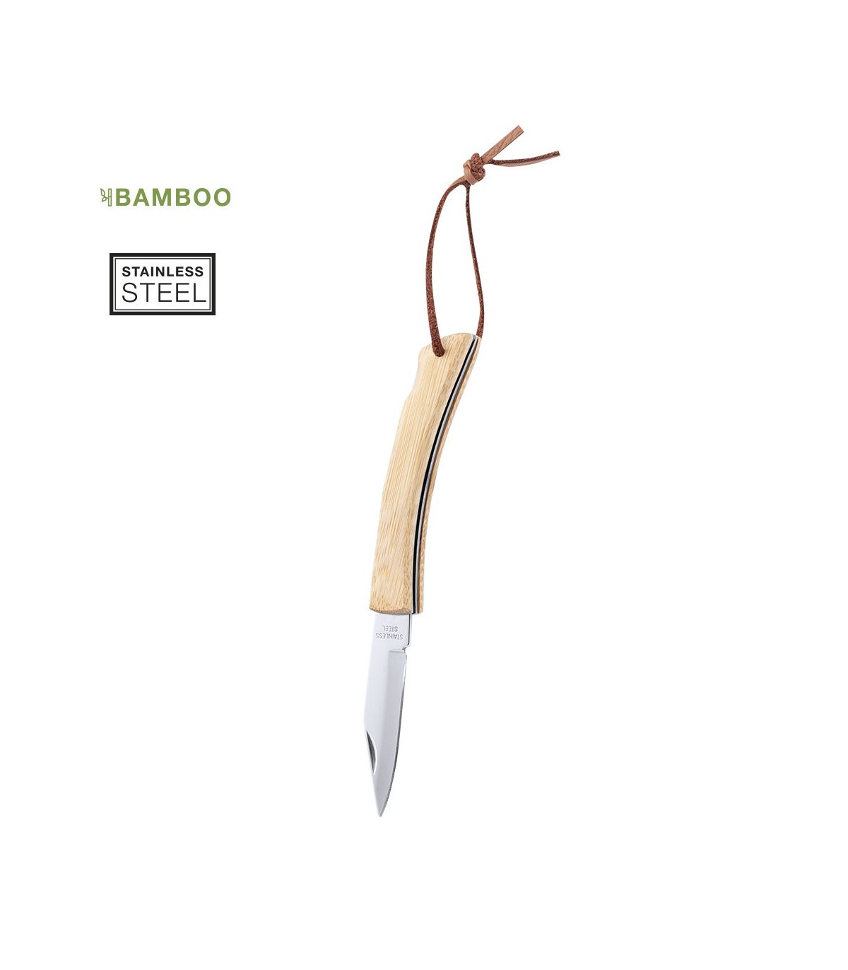 Navaja de línea nature con hoja de acero inox y resistente empuñadura de bambú con bloqueo de seguridad. Con cinta para transporte en polipiel y presentada en caja individual.