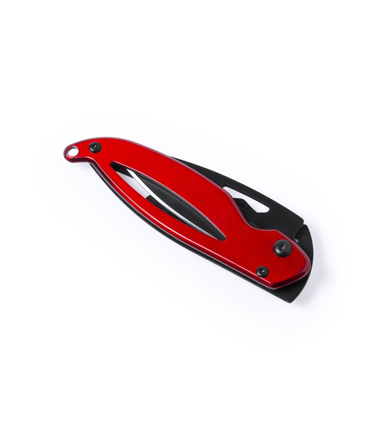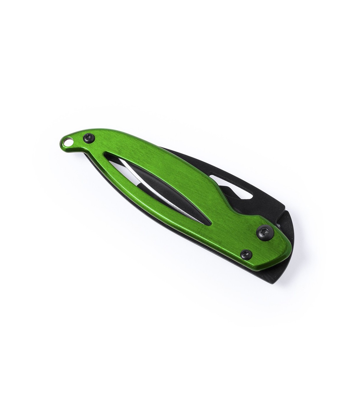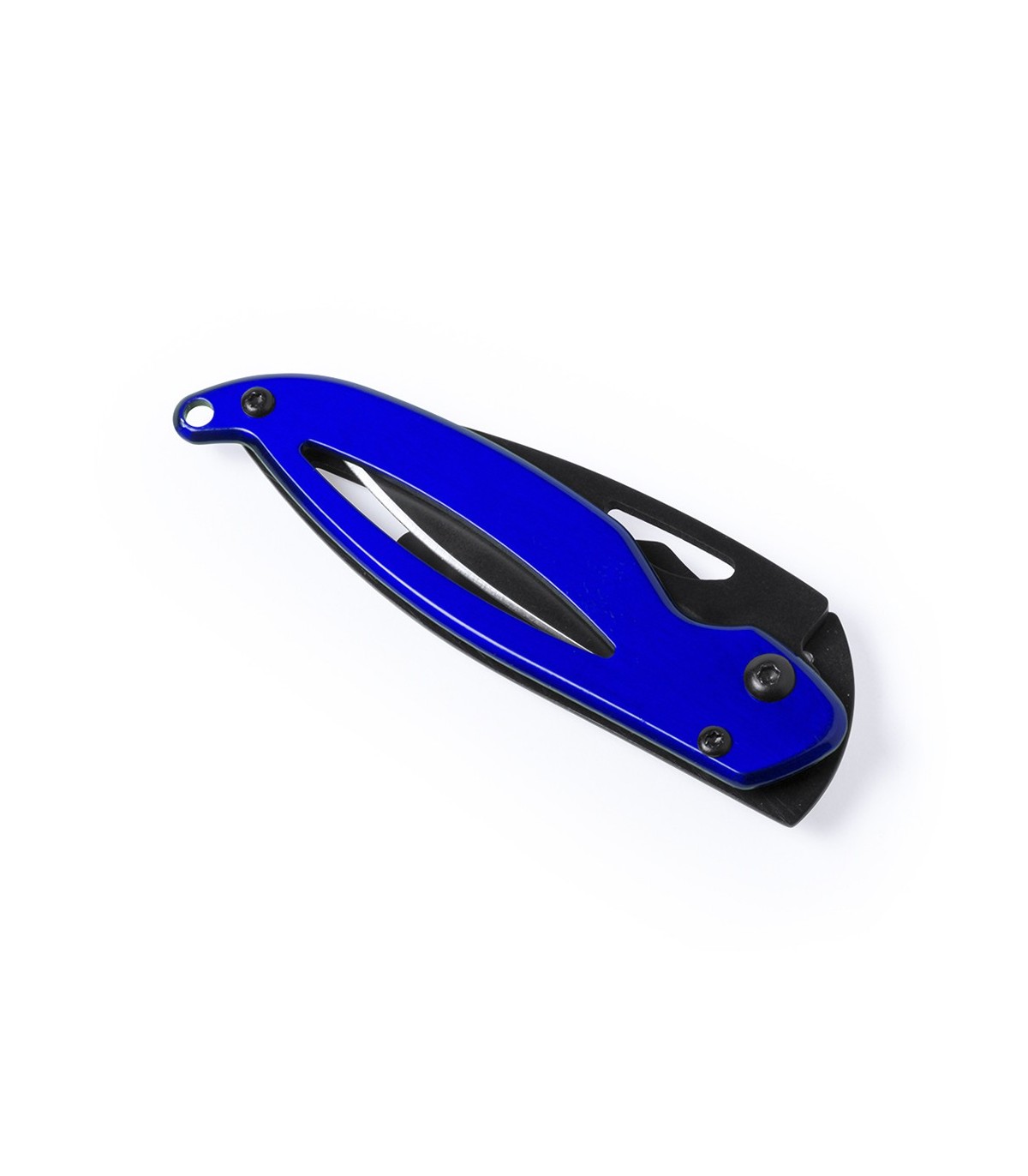 Navaja de alta calidad con hoja en acero inox de color oscuro y empuñadura en acero inox troquelada con bloqueo de seguridad. En variada gama de llamativos colores para imprimir con tu marca, y presentada en caja individual.