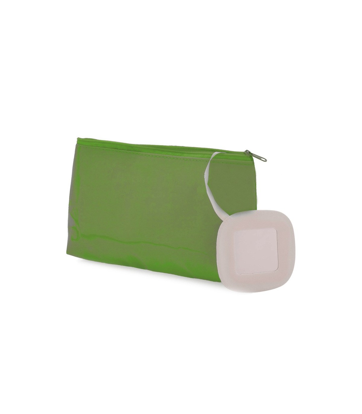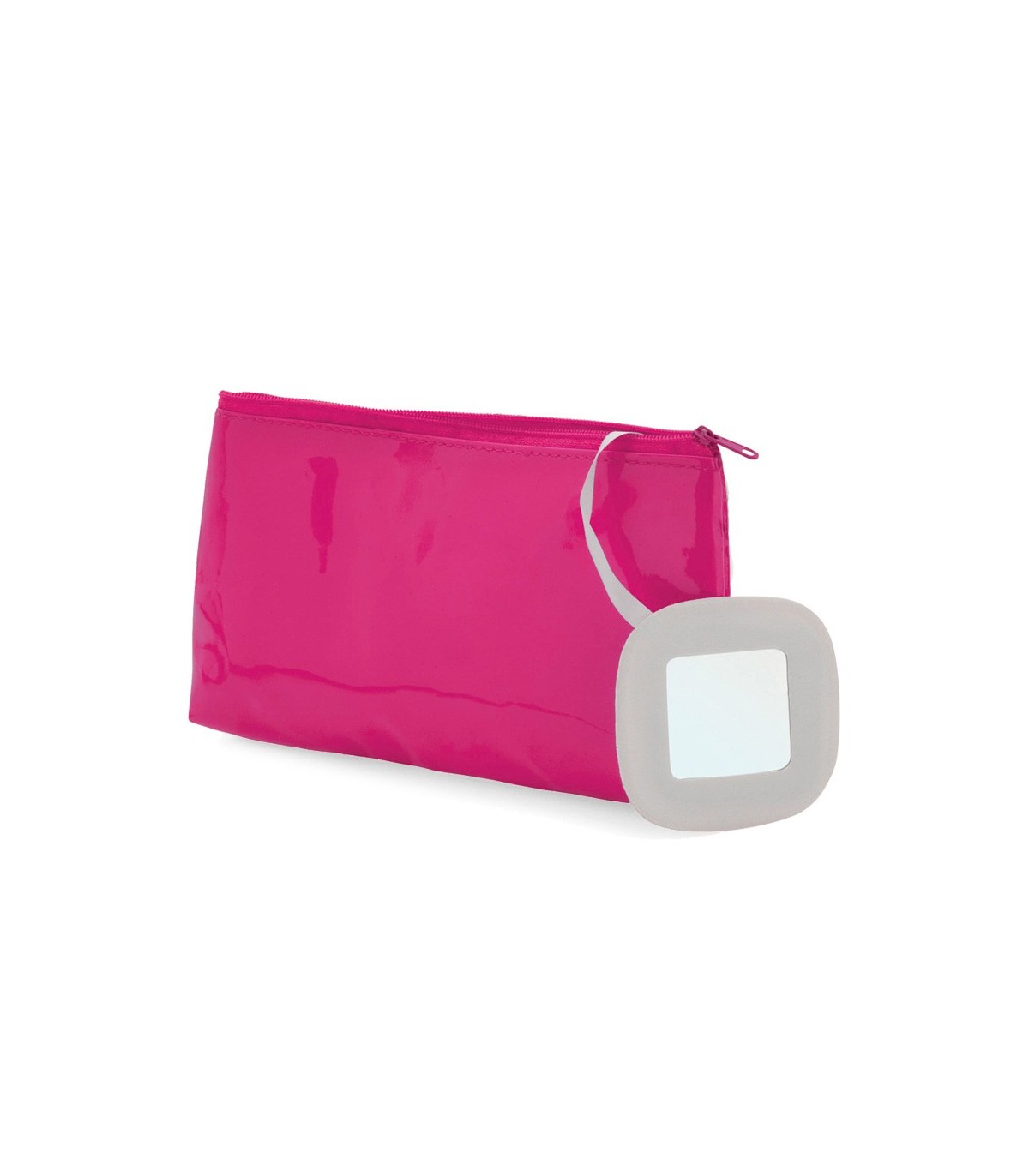 Neceser multiusos en resistente material PVC en originales colores para imprimir. Con espejo interior y cierre de cremallera a juego.