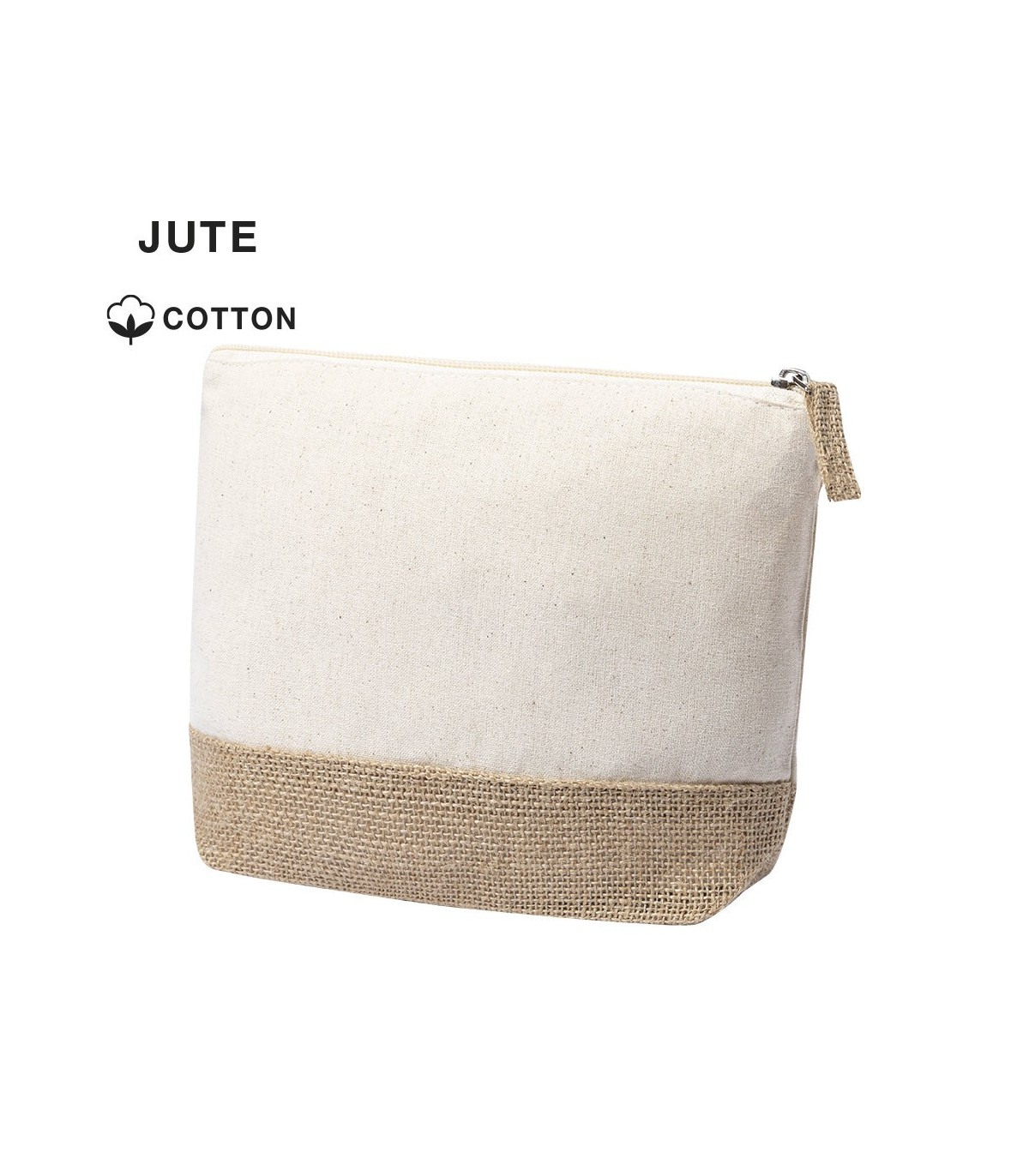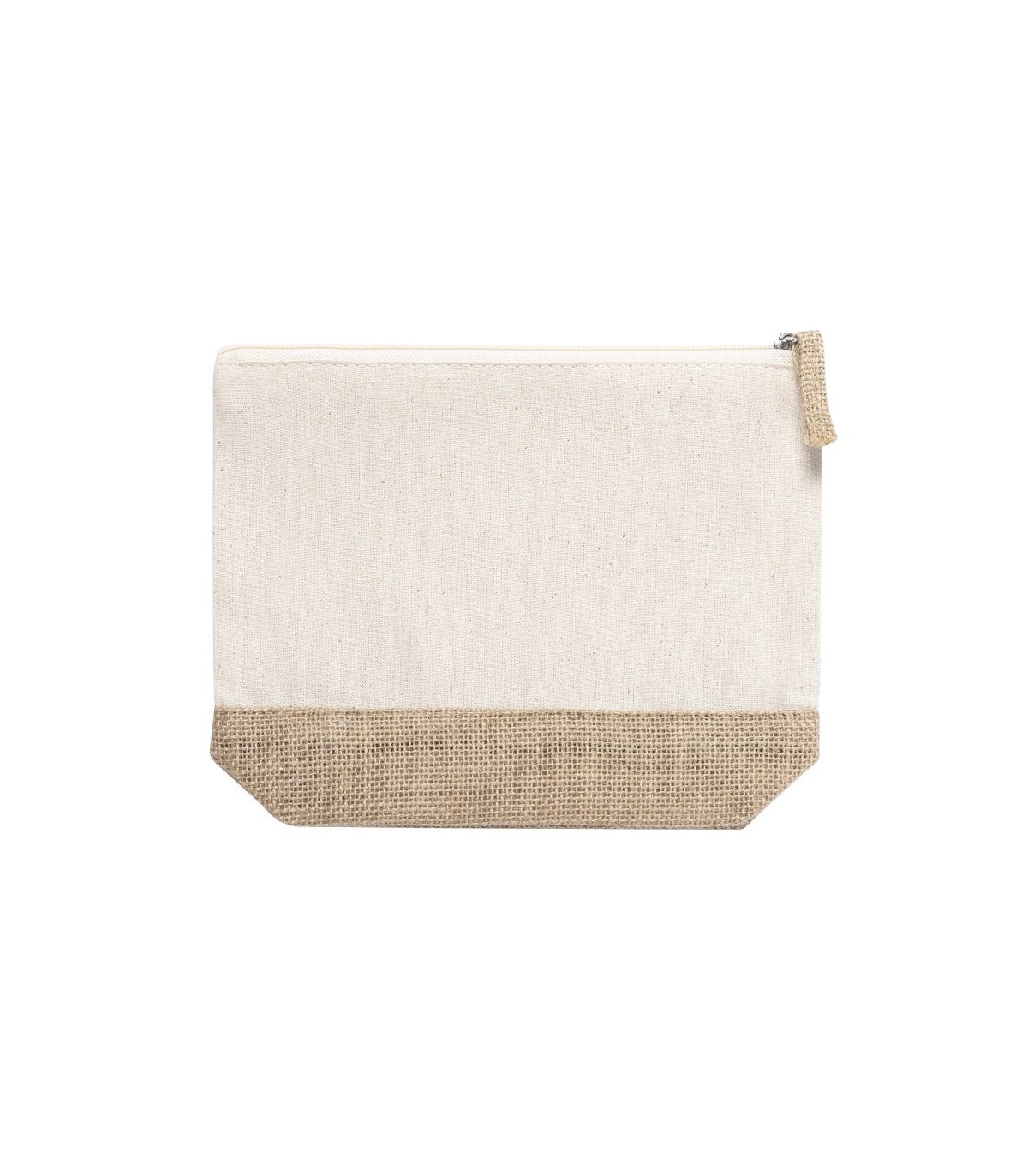 Neceseres ecológicos baratos hechos en yute laminado y algodón natural. Con cierre de cremallera y tirador en yute a juego. Personalizados con tu logo.