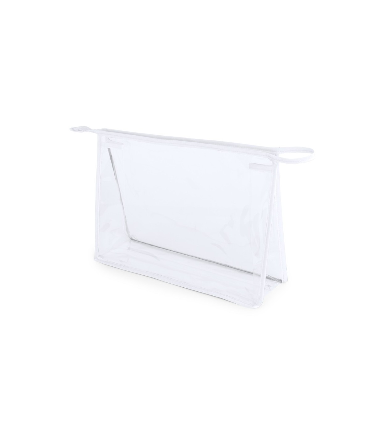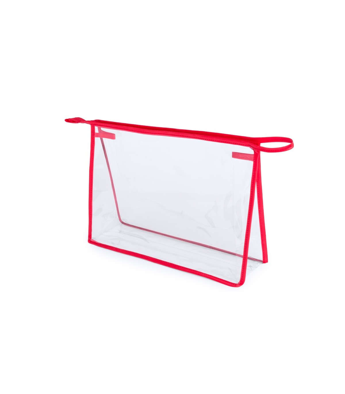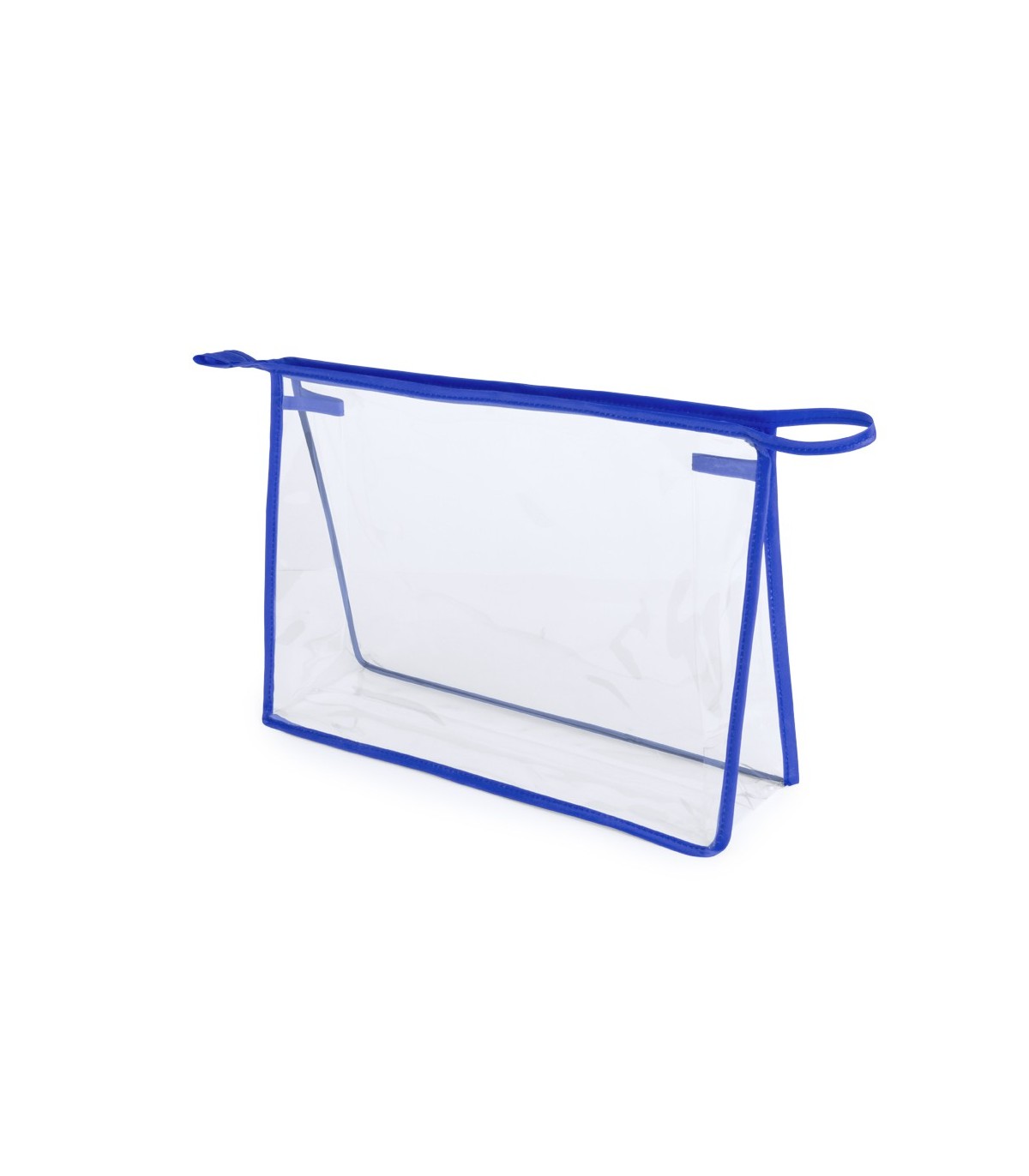 Neceser multiusos en resistente PVC transparente con ribetes de refuerzo en diferentes colores para imprimir con tu logo. Con cremallera y asa de transporte a juego.
