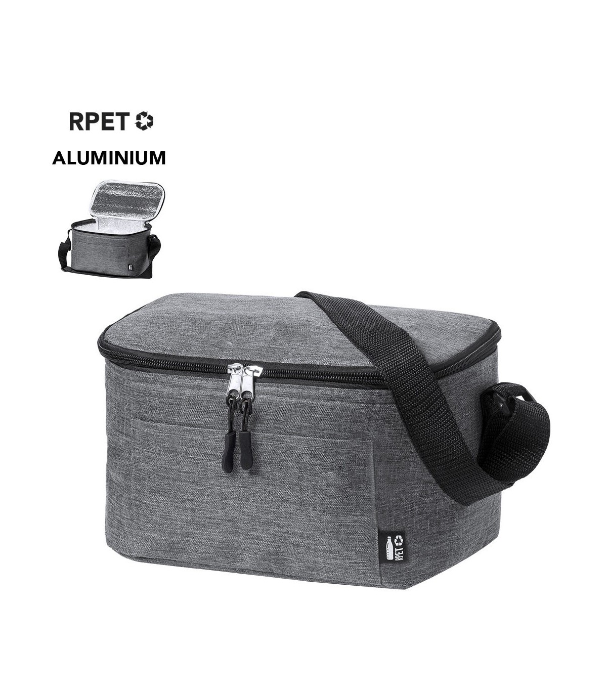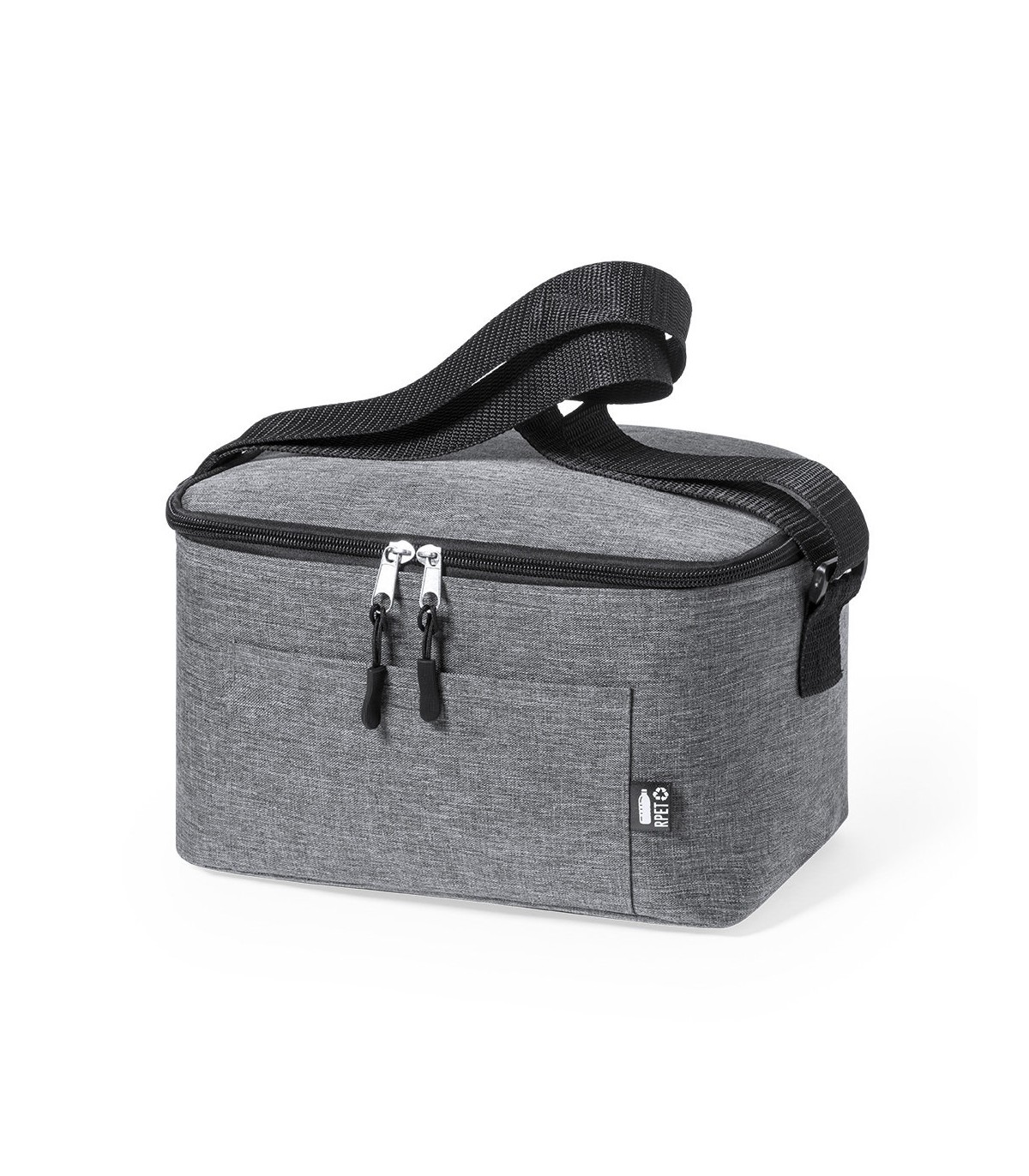 Nevera de fabricación ecológica y en resistente poliéster 600D RPET efecto melange, elaborado a partir de plástico reciclado para promover su reutilización y así disminuir la emisión de agentes contaminantes en nuestro planeta. Detalles en negro y base reforzada. Compartimento principal con cierre de cremallera e interior en aluminio. Incluye bolsillo exterior y cinta bandolera ajustable, con distintivo RPET en etiqueta exterior.