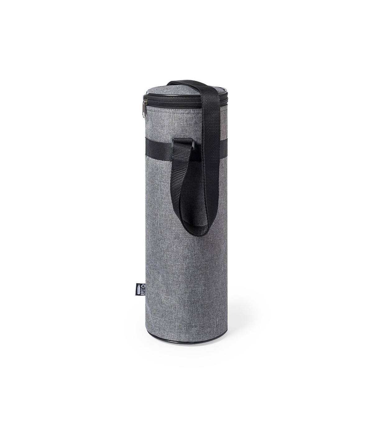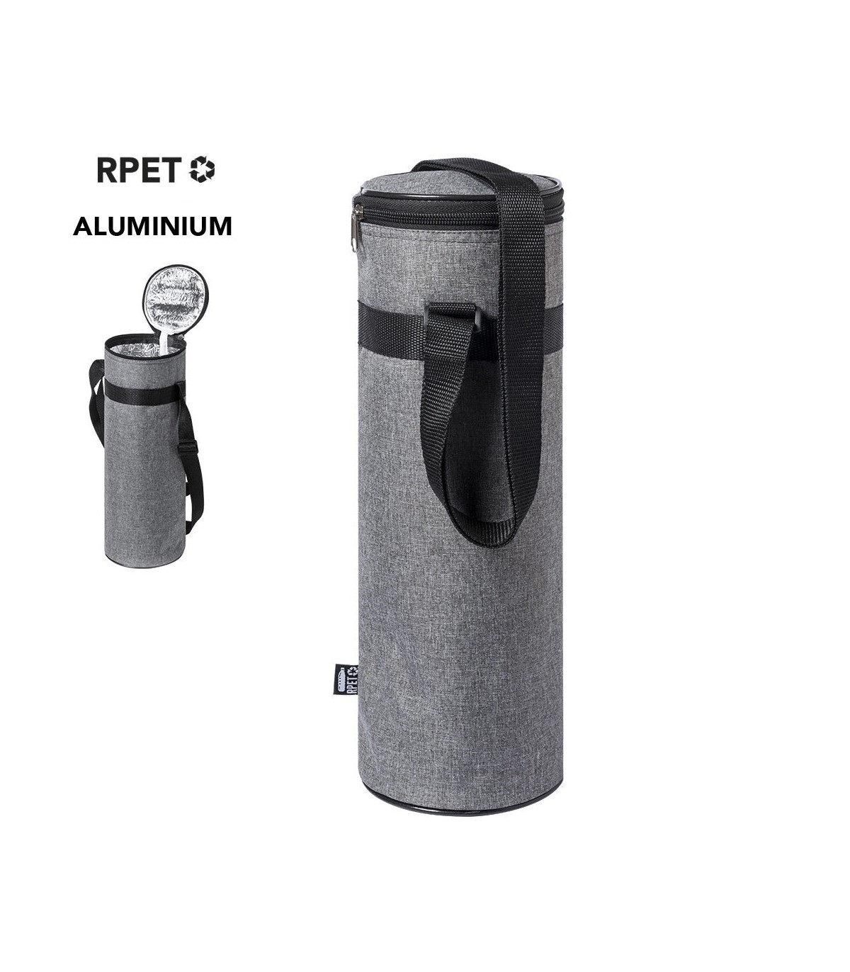 Nevera de fabricación ecológica para botellas de hasta 1,5l, hecho en resistente poliéster 300D RPET, elaborado a partir de plástico reciclado . Con cierre de cremallera y cómoda cinta para hombro ajustable. Interior isotermo en aluminio, con distintivo RPET en etiqueta.