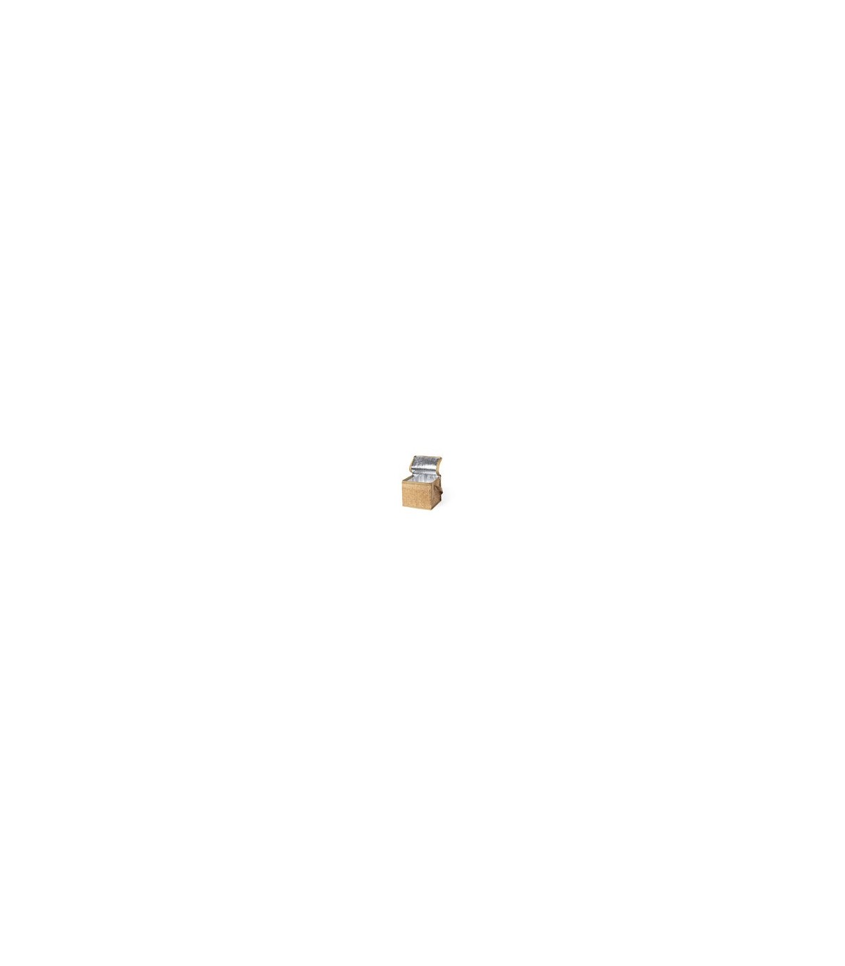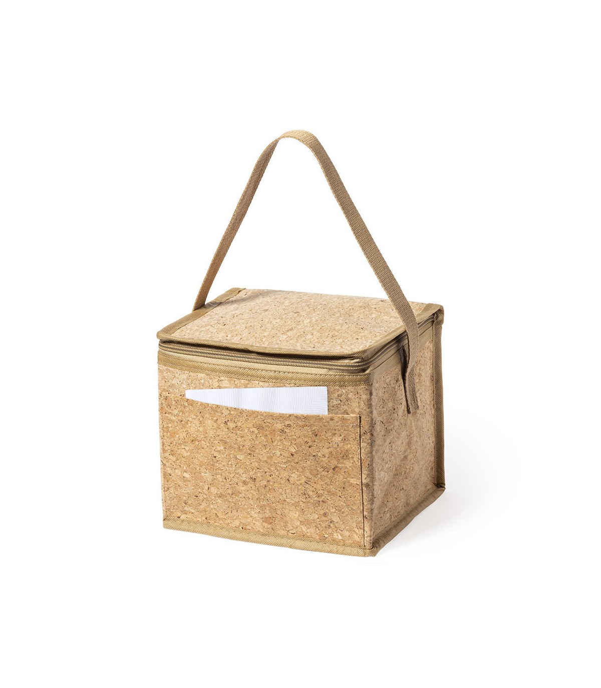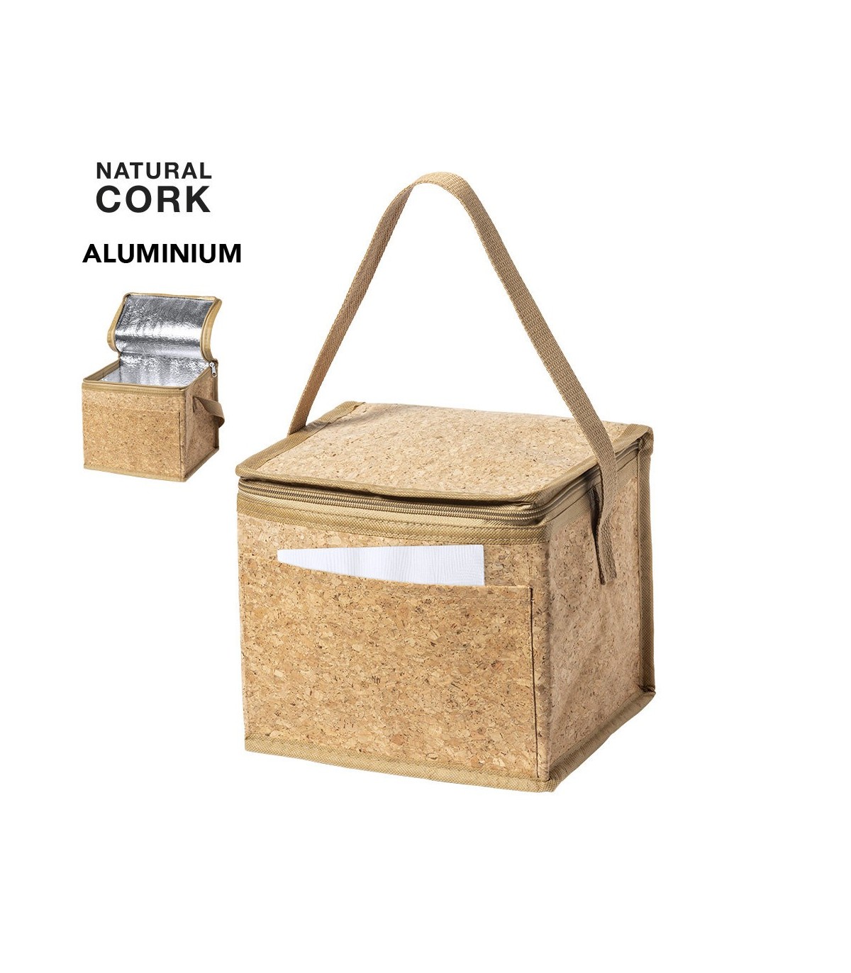 Nevera de fabricación ecológica con capacidad para 6 latas. hecho en corcho natural con interior isotermo acabado en aluminio. Cierre de cremallera y asa de transporte a juego. Incluye bolsillo exterior con amplia superficie de marcaje.