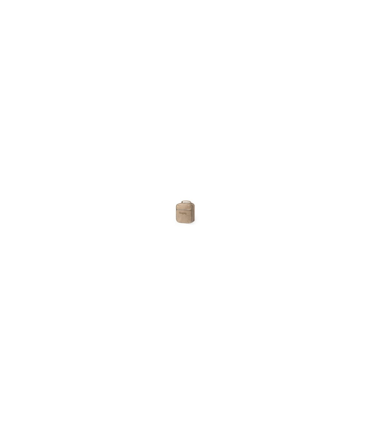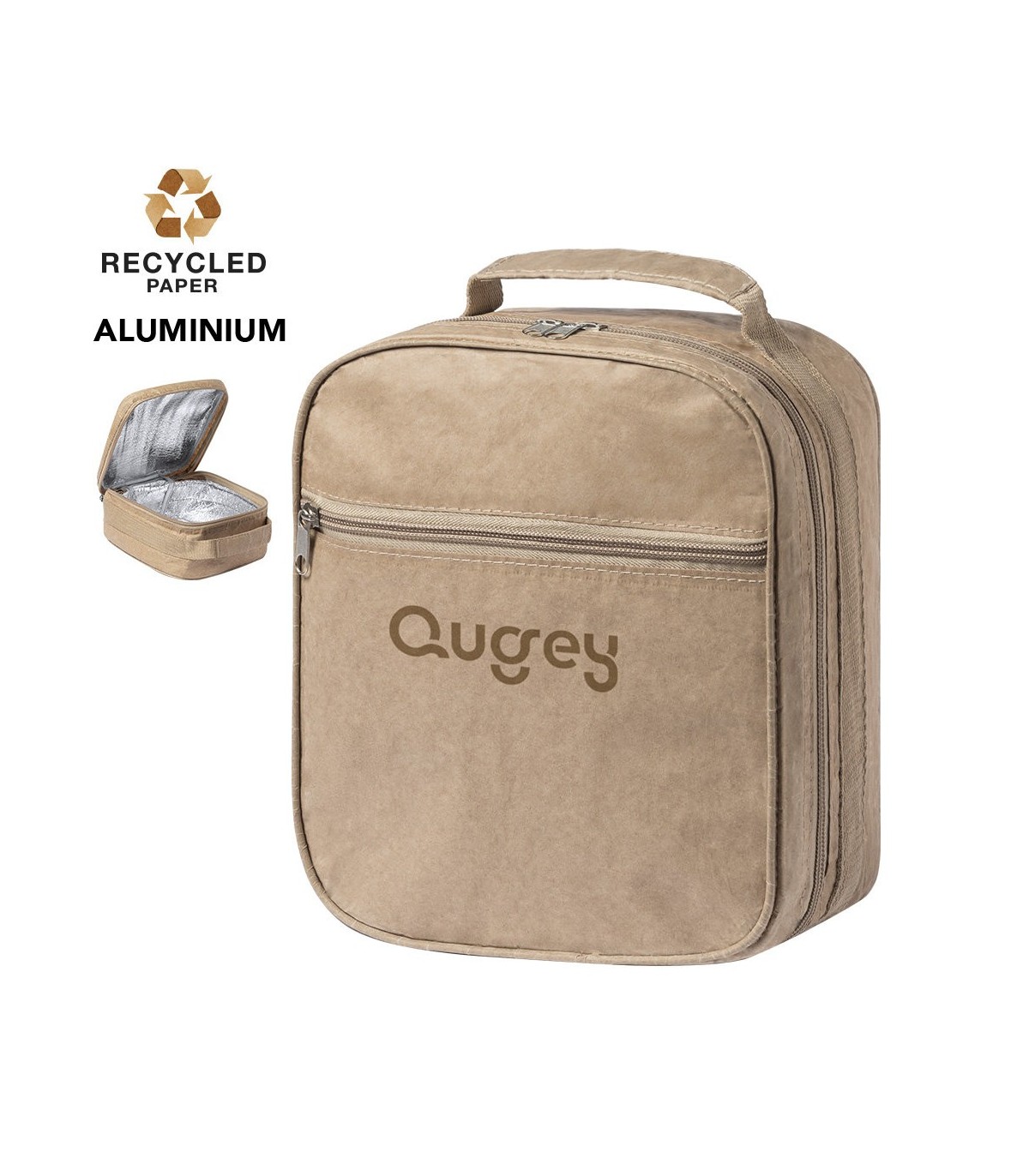 Nevera portátil ecológica, hecha en papel reciclado. Con dos compartimentos de cierre de cremallera con tiradores metálicos. Asa de transporte reforzada e interior isotermo en aluminio.