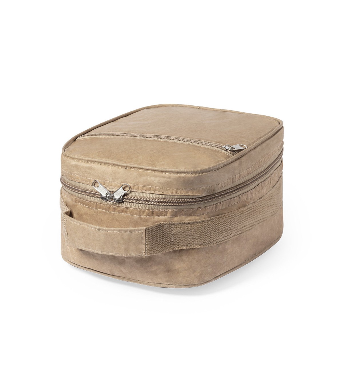 Nevera de fabricación ecológica, hecho en papel reciclado. Con dos compartimentos independientes de cierre de cremallera con tiradores metálicos. Asa de transporte reforzada e interior isotermo en aluminio.