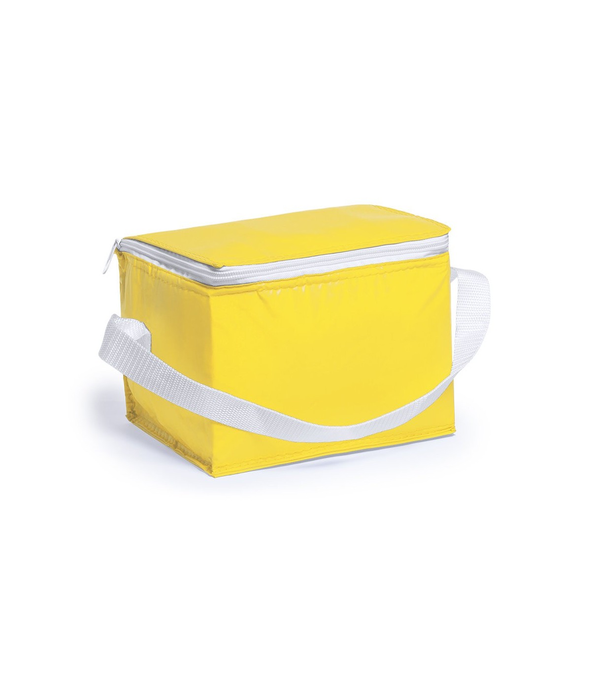 Nevera de 6 latas en resistente PVC de vivos colores. Interior isotermo en acabado de aluminio. Con cremallera y asa de transporte en color blanco a juego.