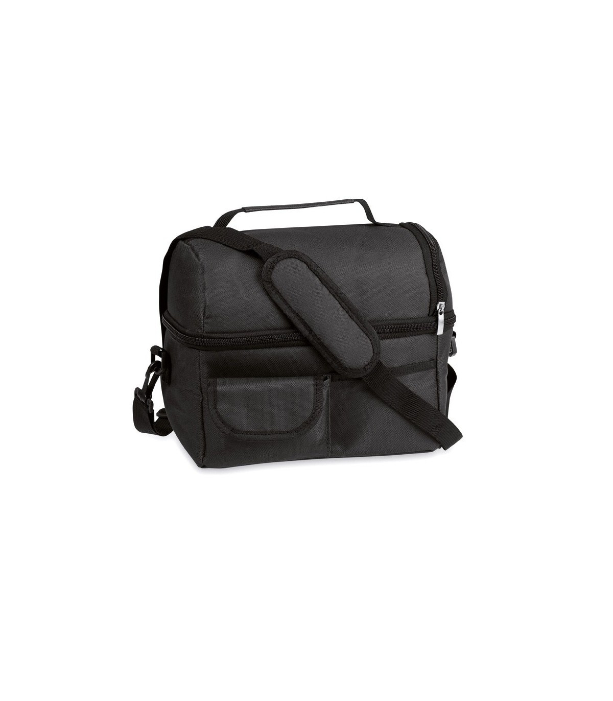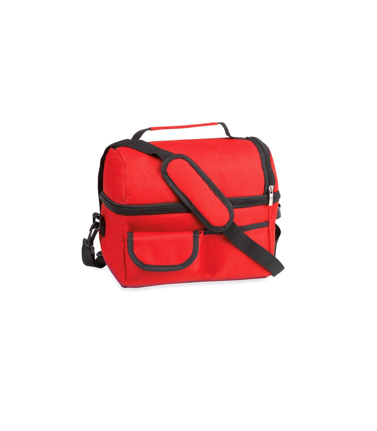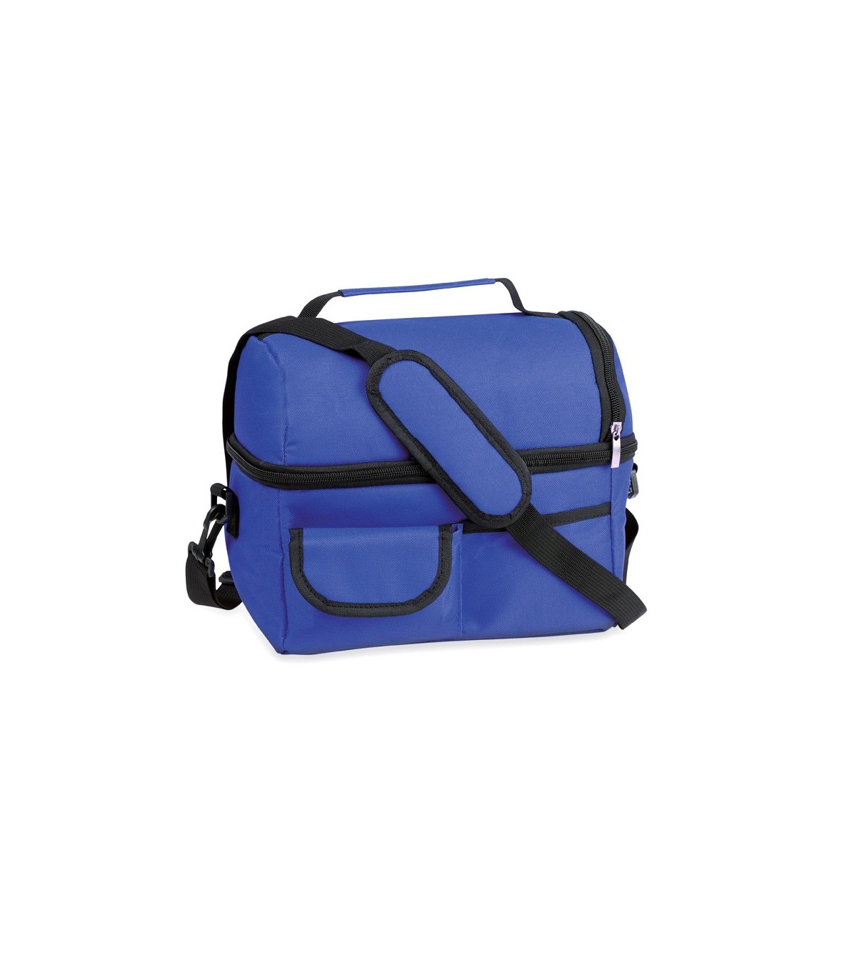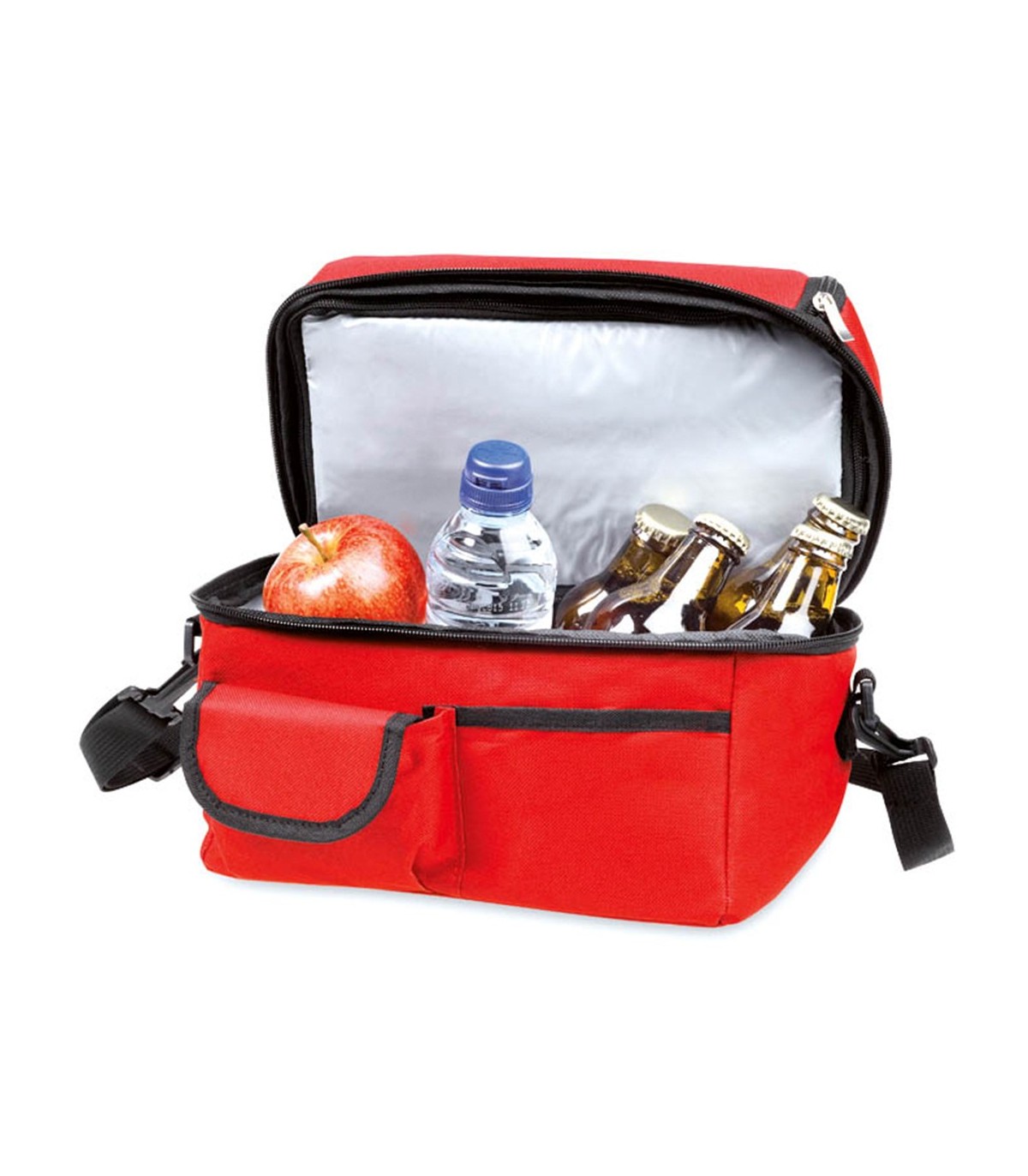 Nevera todoterreno en resistente poliéster 600D de vivos colores y con dos compartimentos independientes de cierre de cremallera. Con 2 bolsillos en parte frontal, uno de ellos con cierre de velcro y bolsillo de redecilla elástica en parte posterior. Interior isotermo en acabado de aluminio. Con cinta para hombro extensible con cierre de mosquetón y refuerzo acolchado para hombro a juego.