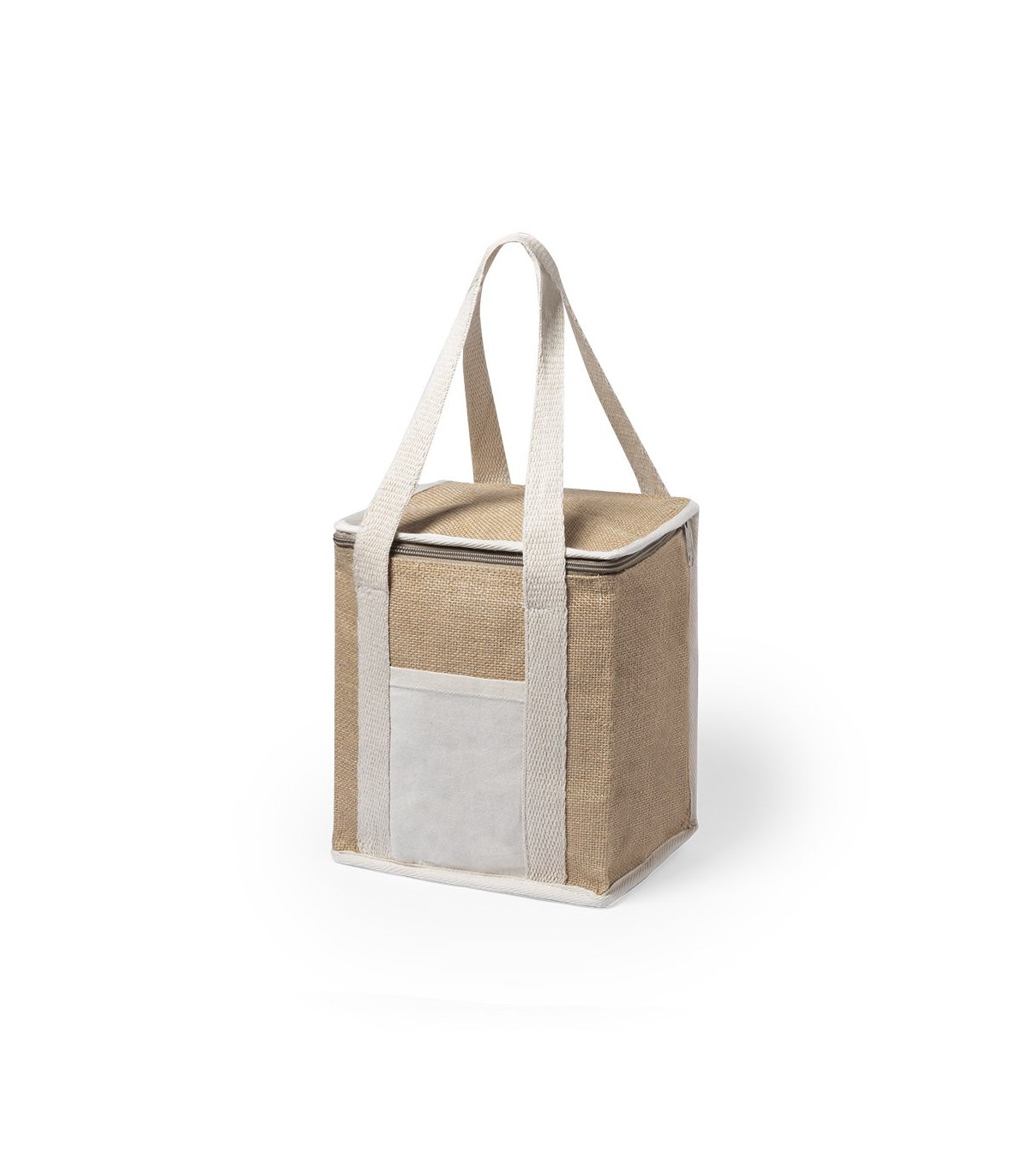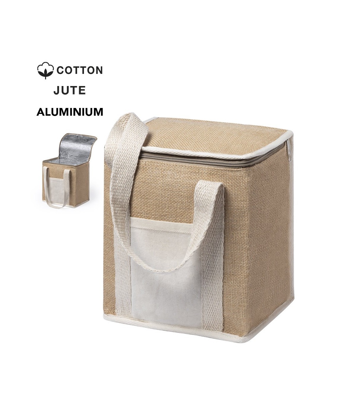 Neveras para take away, fabricada en yute laminado resistente a la humedad, con interior isotermo acabado en aluminio y cremallera a juego. Asas y bolsillo exterior .