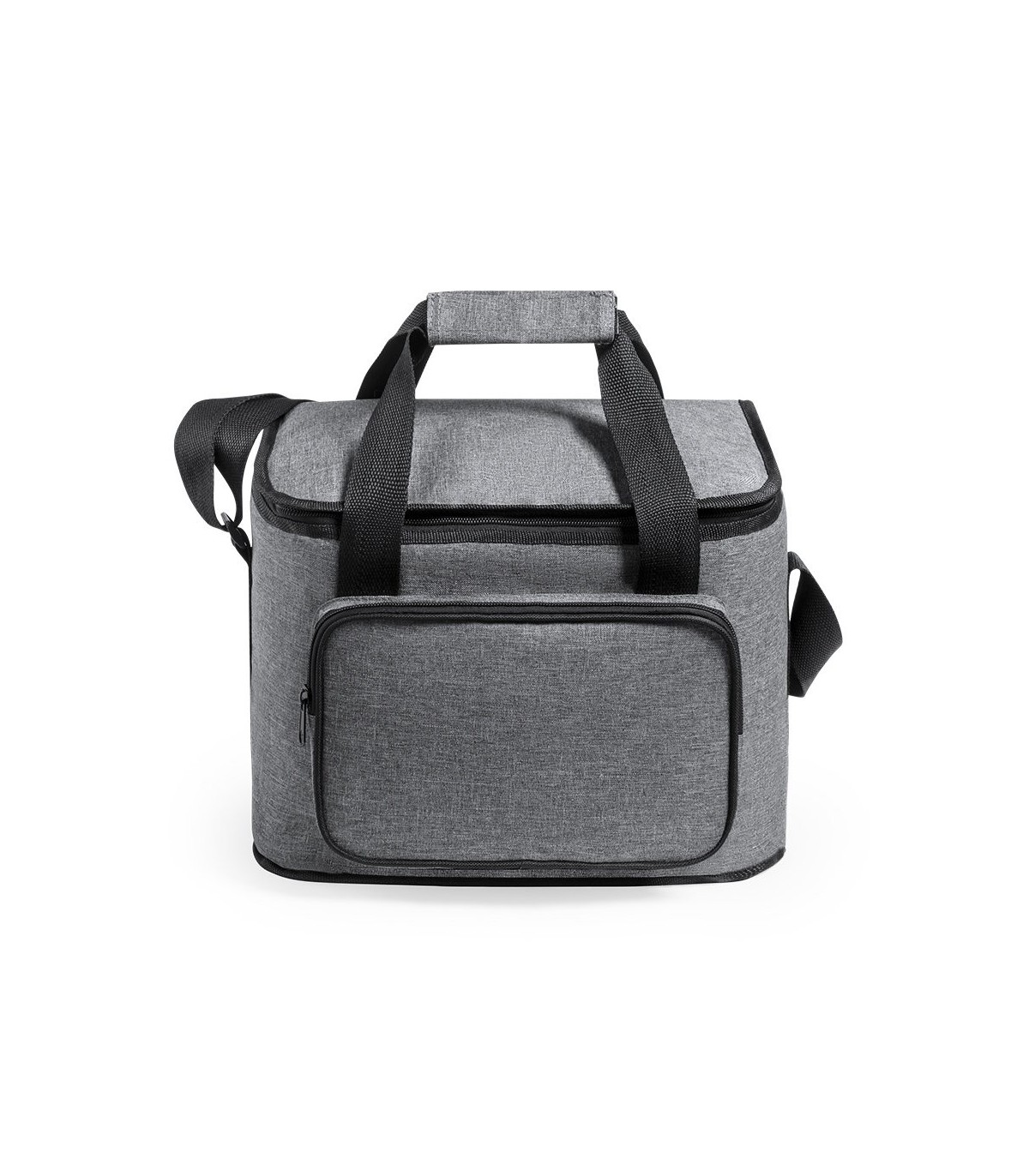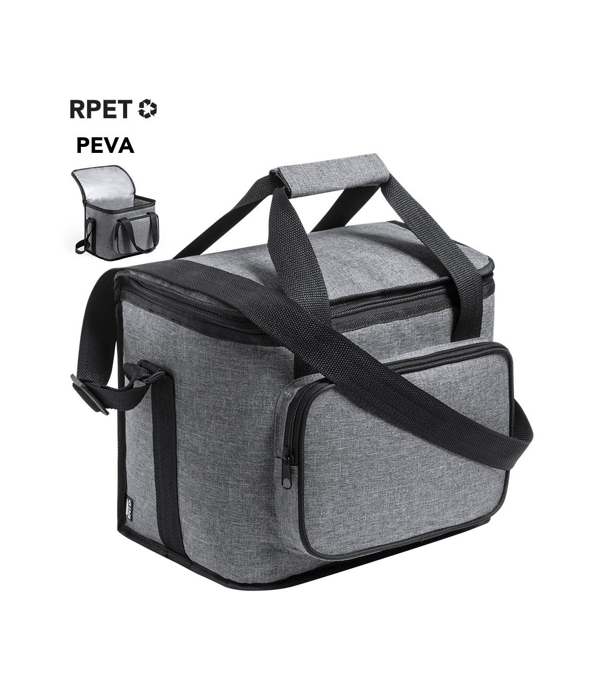 Nevera en plástico reciclado con compartimento principal con cierre de cremallera e interior en PEVA. Incluye bolsillo exterior de cremallera, asas reforzadas con velcro y cinta bandolera ajustable.
