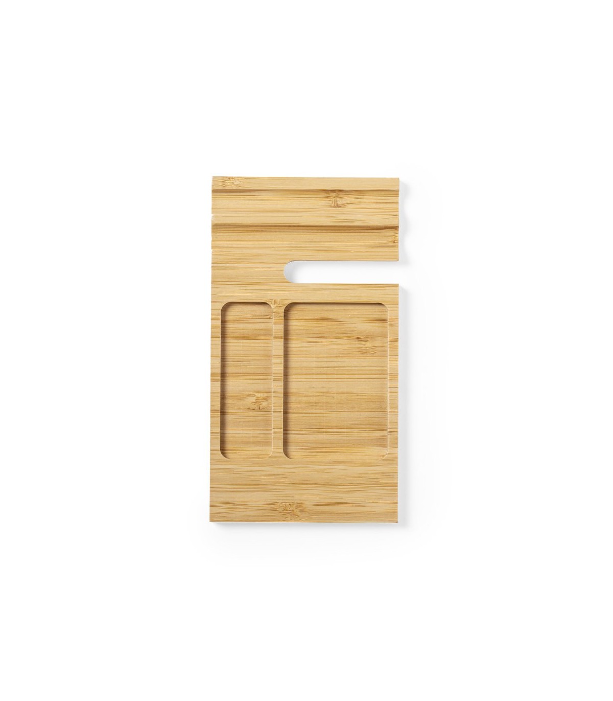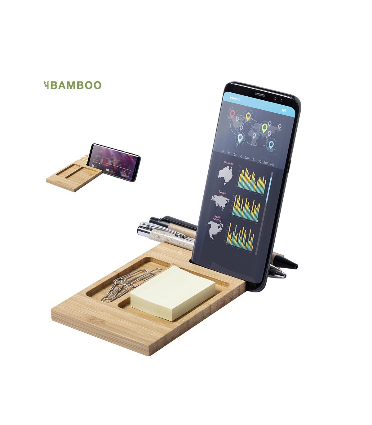 Organizador con función soporte para smartphone, soporte para bolígrafos, clips y notas adhesivas (accesorios no incluidos). Fabricado en bambú.