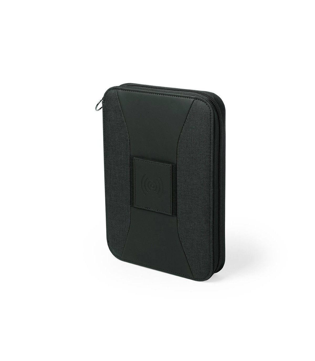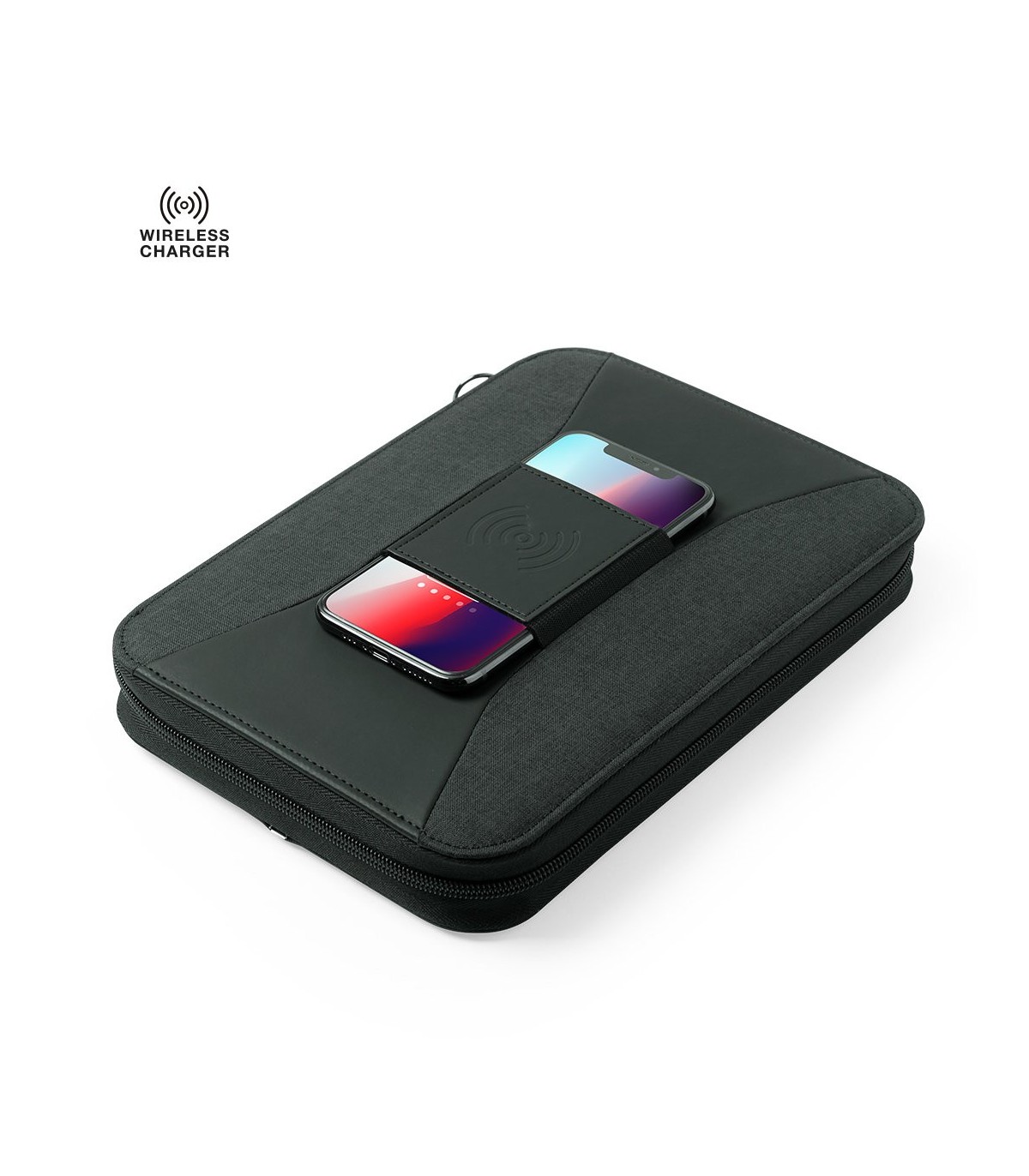 Organizador power bank con cargador inalámbrico integrado en la portada, con soporte para sujeción del smartphone. Incluye batería auxiliar de 4.000 mAh de capacidad de carga integrada.