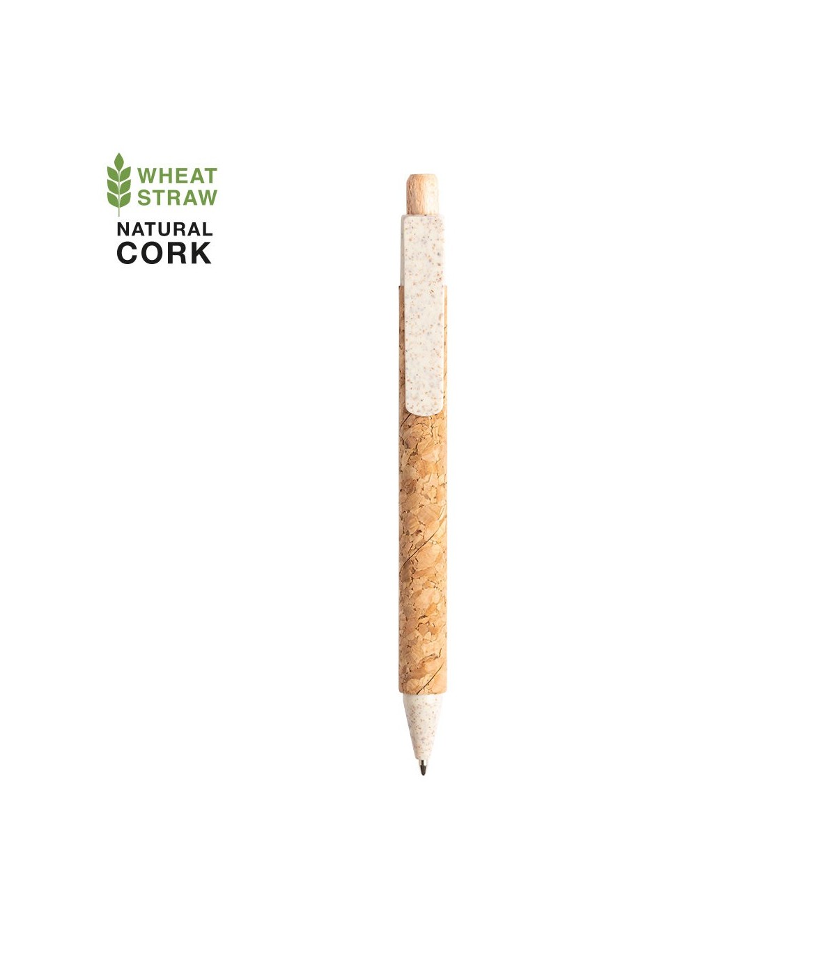 Bolígrafo de fabricación ecológica con cuerpo en corcho natural. Clip, punta y pulsador en caña de trigo, para así fomentar la utilización de materias primas naturales y reducir las emisiones de contaminantes. Con clip especialmente diseñado para marcaje en tampografía. De apertura mediante pulsación y con tinta azul.