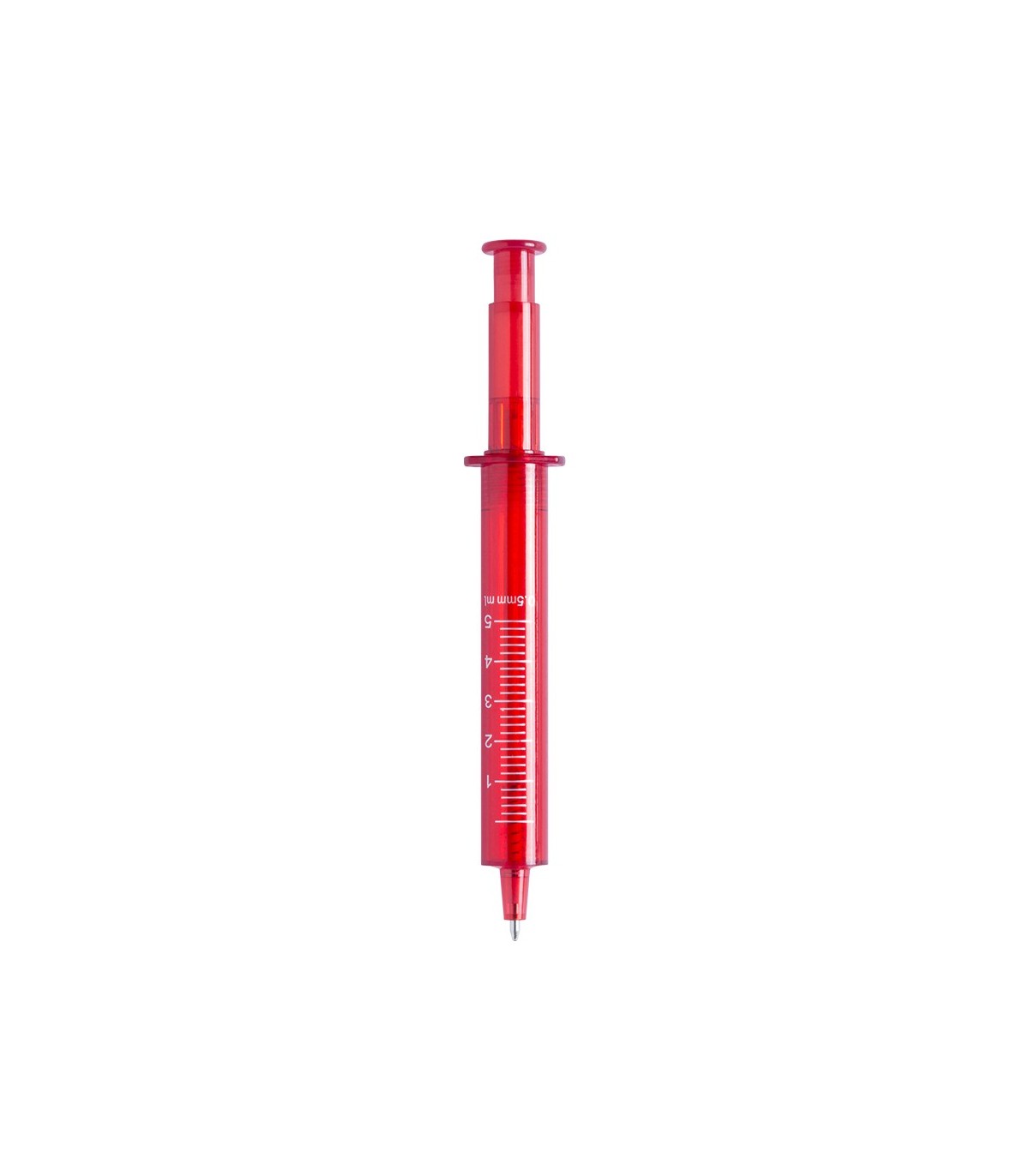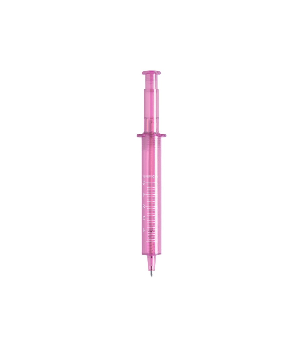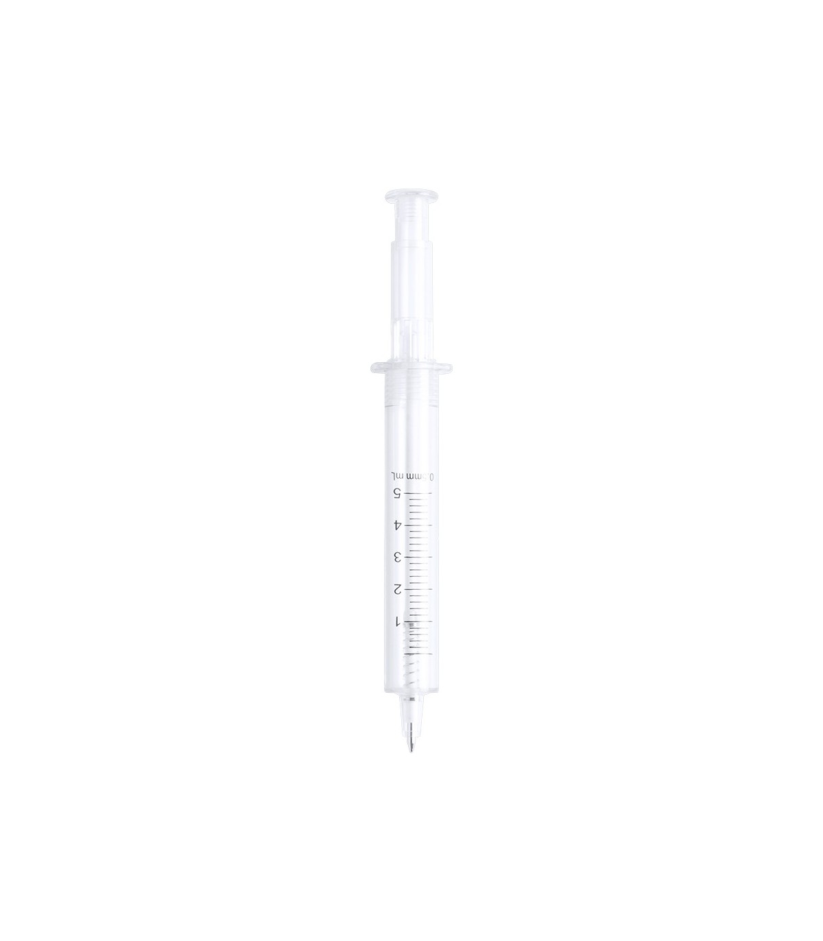 Original bolígrafo con diseño de jeringuilla y cuerpo transparente en diversa gama de llamativos colores. De tinta azul.