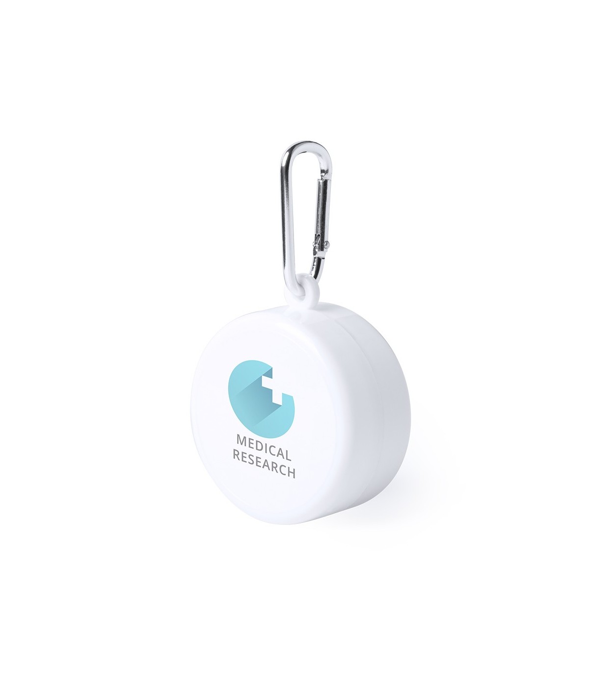 Original vaso plegable para emergencias en elegante color blanco. De 220ml de capacidad y pastillero con tapa integrado en el tapón. Con mosquetón metálico de transporte.