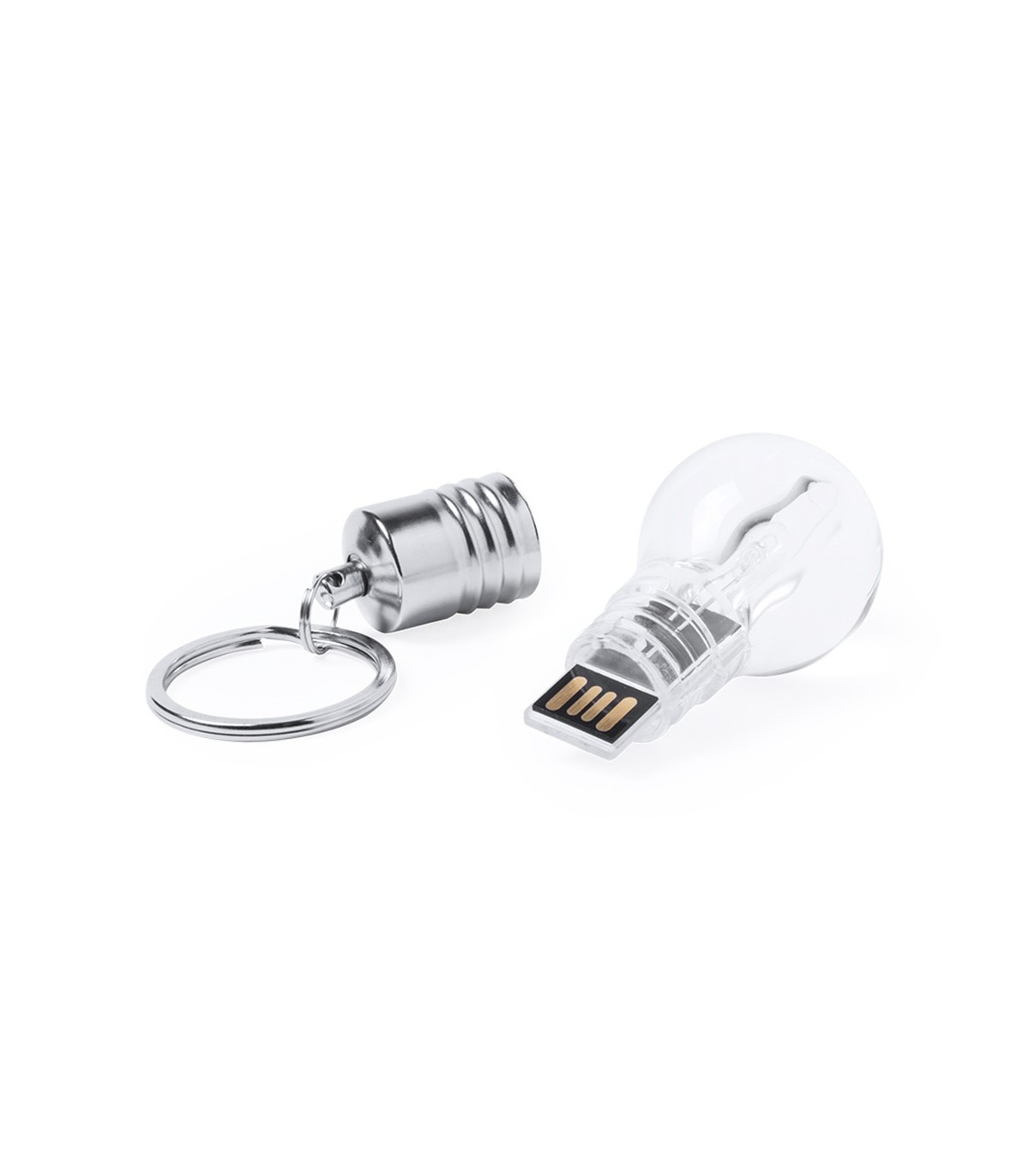Memoria USB de 8GB de capacidad con original diseño de bombilla que se ilumina con luz blanca al conectarla al puerto USB. Con llavero y presentada en estuche individual.