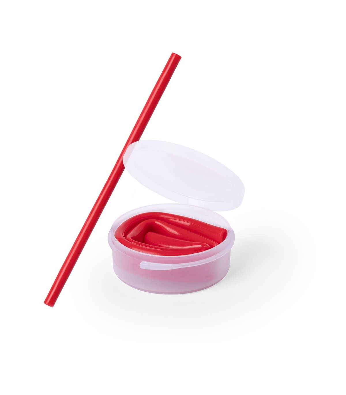 Pajita de silicona flexible y reutilizable, de 25,5cm de largo. Disponible en variada gama de colores brillantes y presentada en estuche de PP con acabado translúcido.
