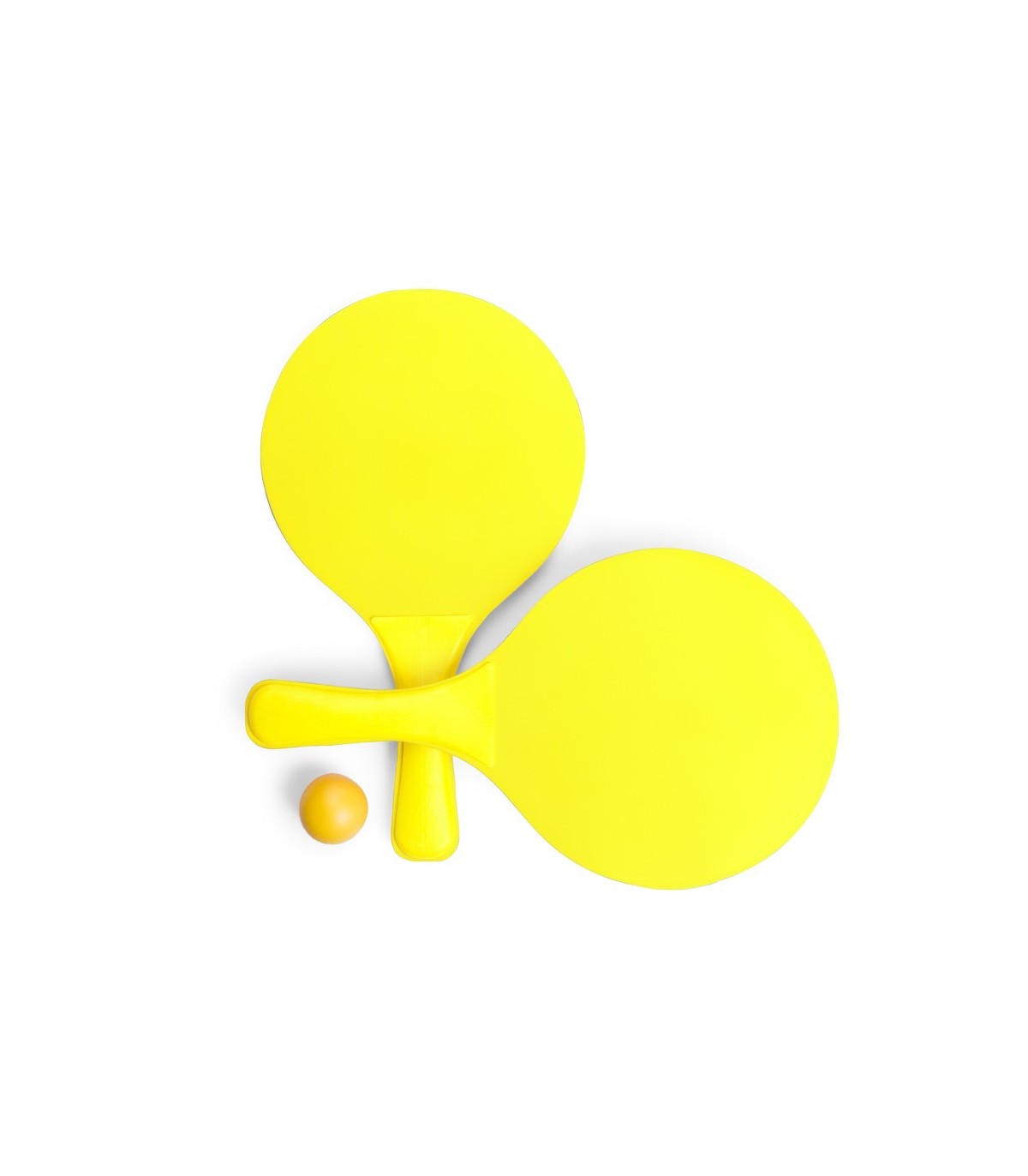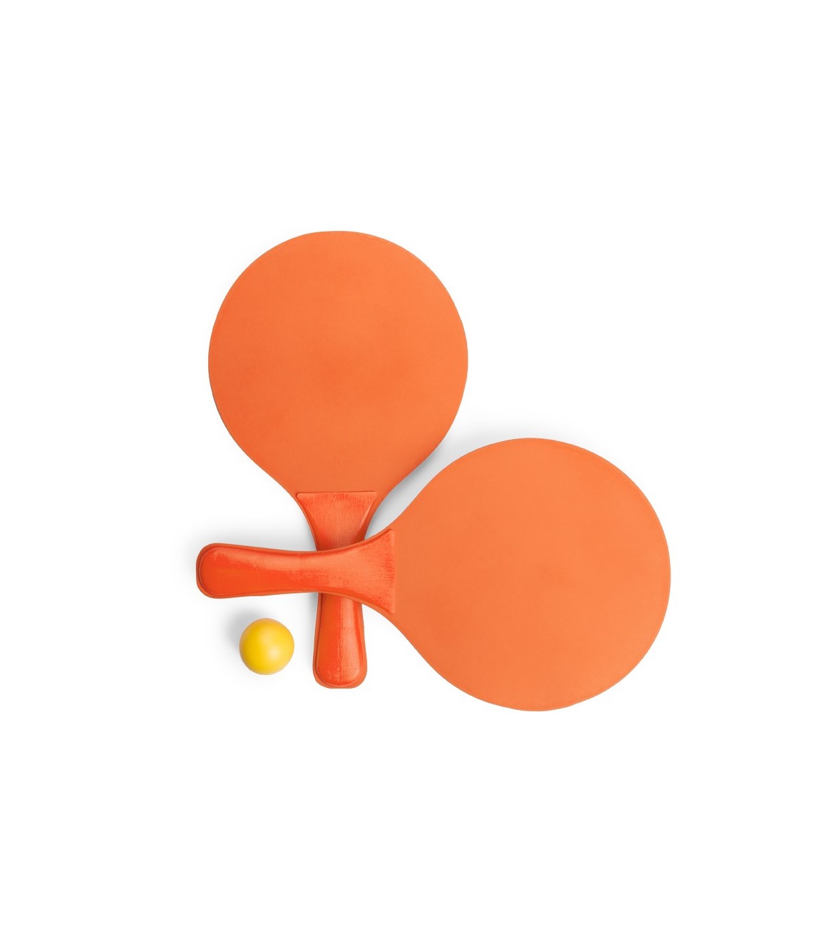 Palas de playa en madera natural de alta calidad Con mango reforzado a juego y presentadas en bolsa redecilla con pelota personalizadas para regalos publicitarios.
