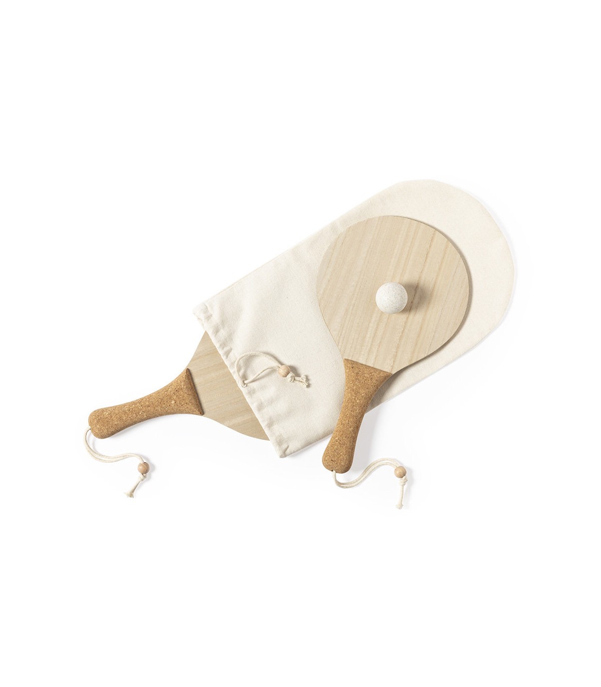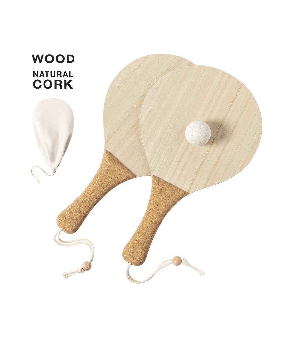 Par de palas de playa de fabricación ecológica. elaboradas en madera, con mango reforzado en corcho natural y cintas para muñeca con ajustador. Presentadas en bolsa de algodón natural con cierre de cordón y pelota en caña de trigo.