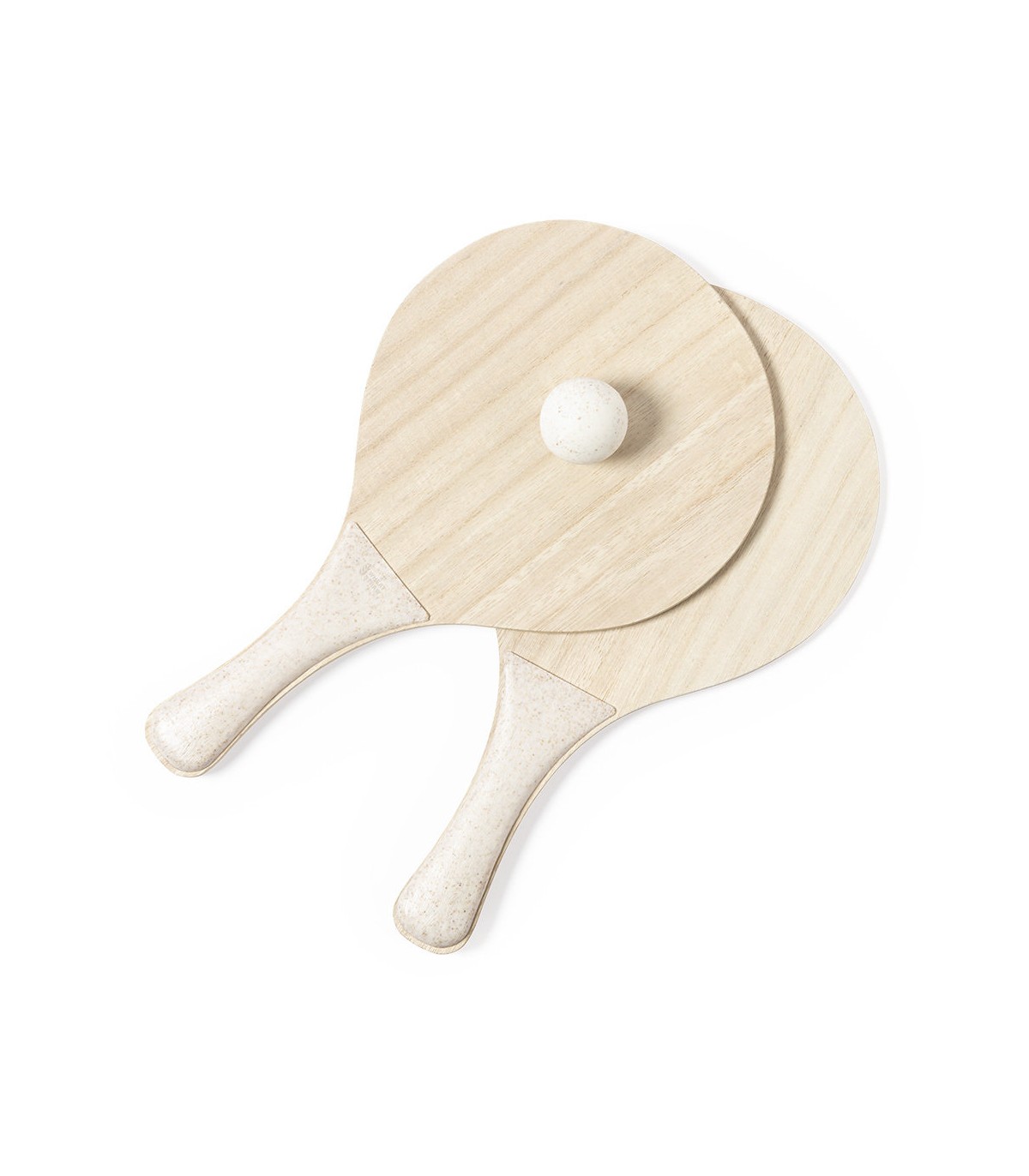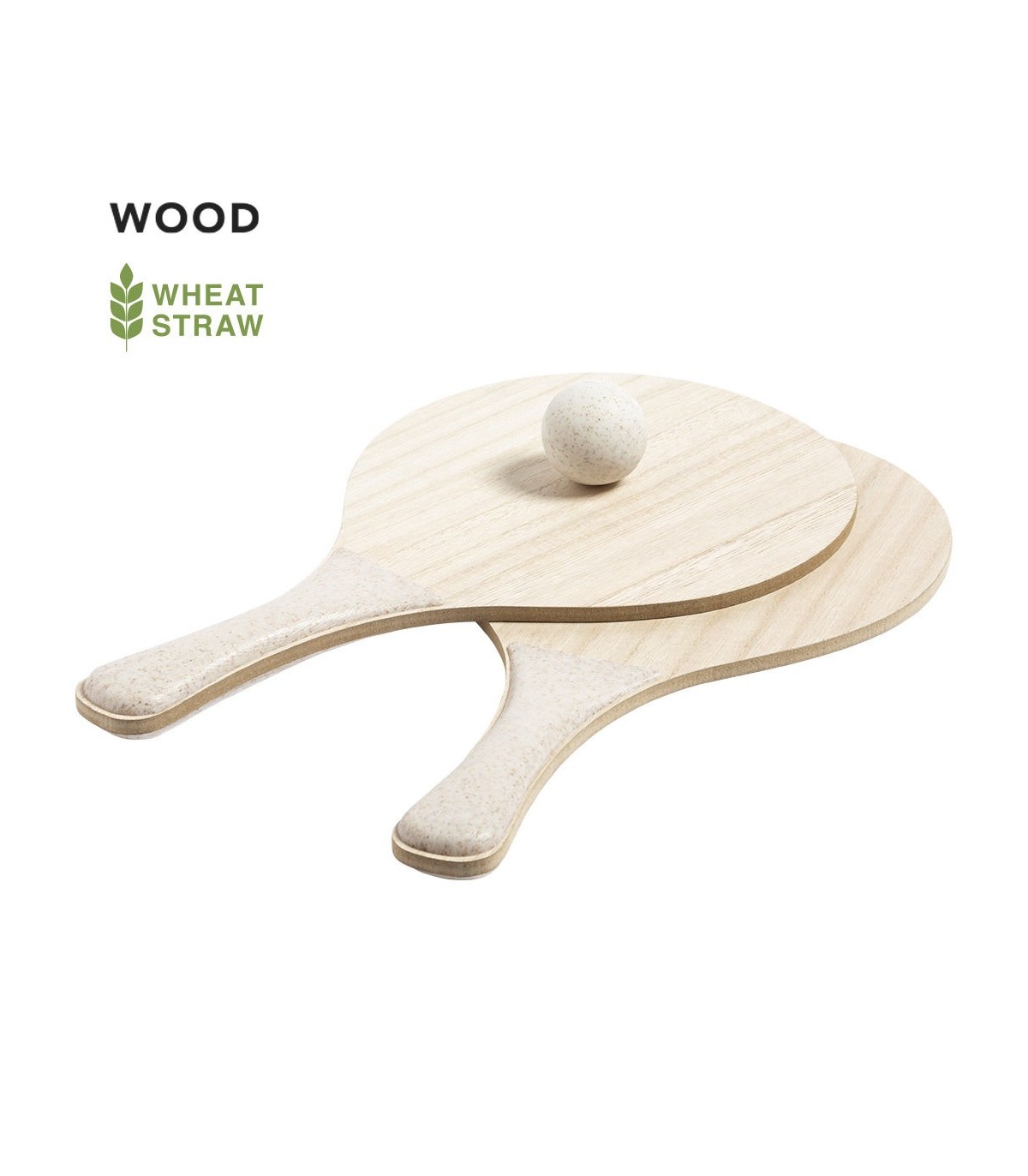 Par de palas de playa de fabricación ecológica. Hechas en madera, con mango reforzado en caña de trigo. Presentadas en bolsa de rejilla y con pelota de caña de trigo. Distintivo en el mango.