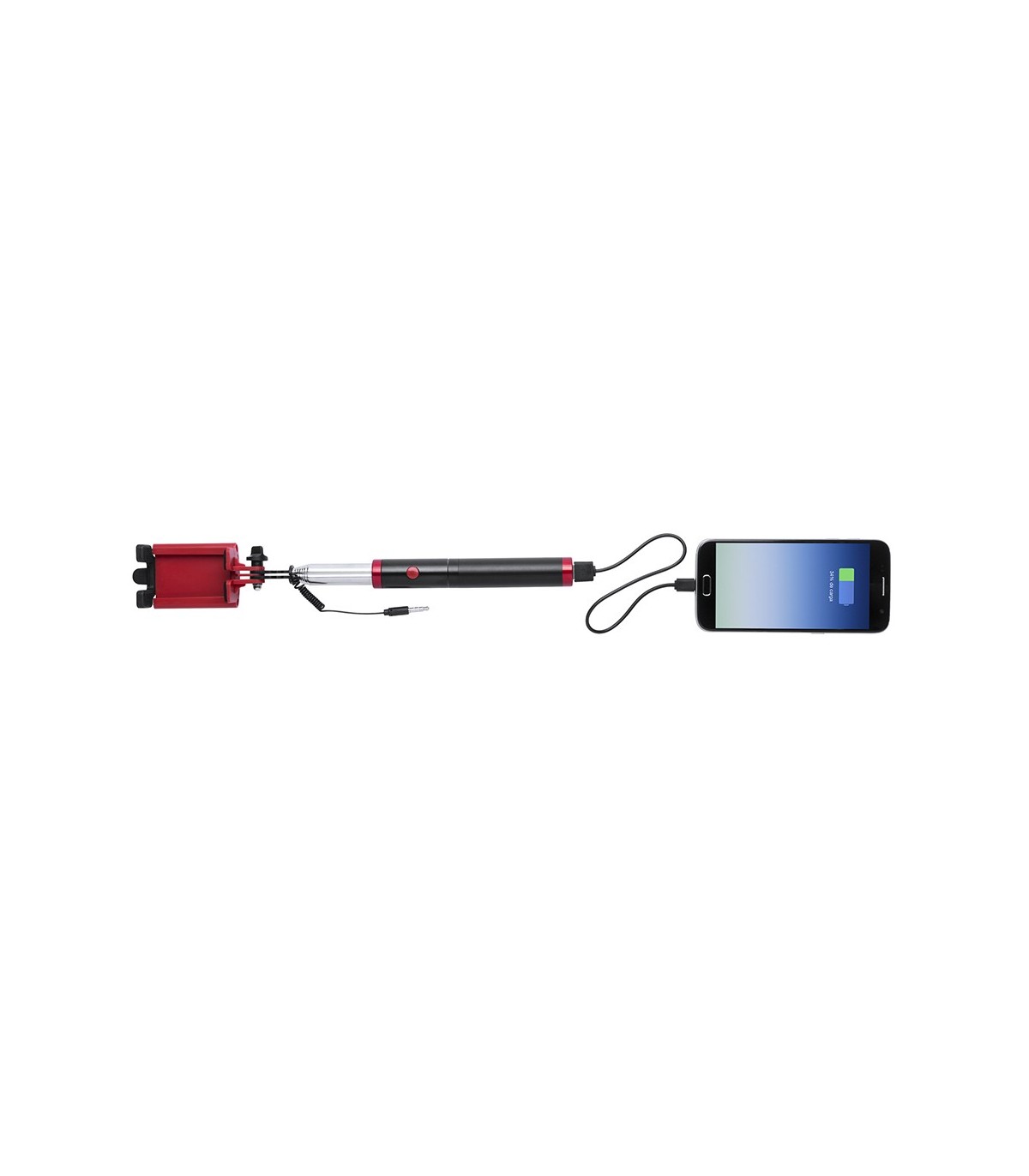Monopod con power bank en acero inoxidable con conexión jack y 7 posiciones diferentes ideal para regalos promocionales.