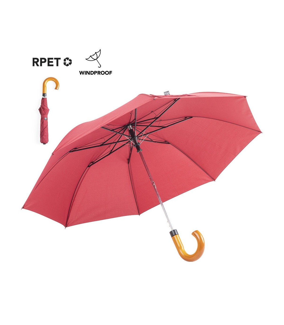 Paraguas plegable de fabricación ecológica de 100cm de diámetro. En material pongee 190T RPET, elaborado a partir de plástico reciclado, para así fomentar la reutilización de residuos plásticos y ayudar a la sostenibilidad del planeta. De apertura automática, con mecanismo anti viento y varillas metálicas. Mango curvo de madera y distintivo RPET en etiqueta. Disponible en variada gama de colores, con funda RPET a juego.