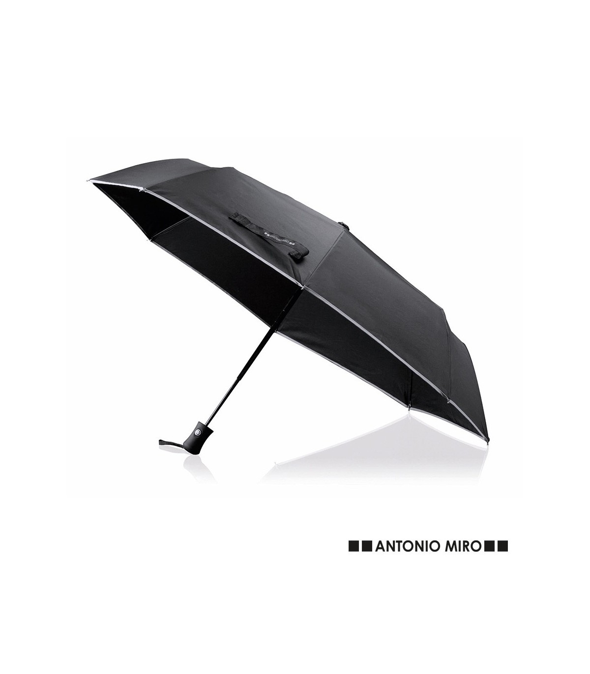 Paraguas plegable de Antonio Miró, de 8 paneles y elegante diseño en color negro con ribetes en color blanco. De 95cm de diámetro, con mecanismo automático de apertura y cierre, sistema antiviento y en resistente material pongee. Con varillas metálicas en color negro, cierre de velcro y mango ergonómico con cinta de transporte. Presentado en funda individual a juego con logotipo de la marca.