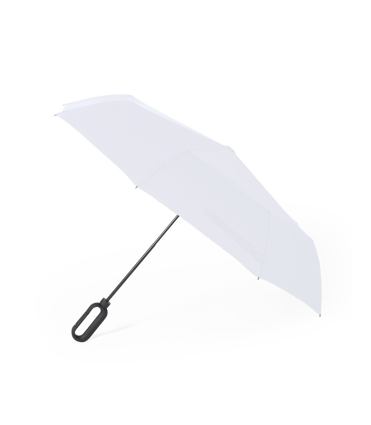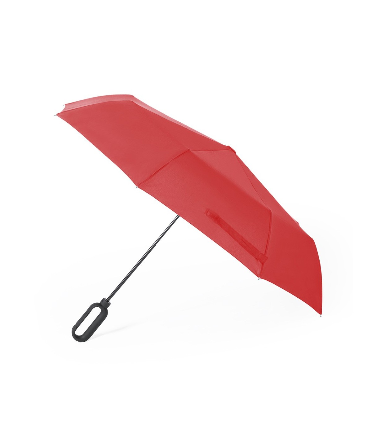 Paraguas plegable de 8 paneles en diferentes colores llamativos para personalizar. De 100 cm de diámetro, apertura manual, con sistema antiviento y en resistente material pongee. Con varillas de fibra en color negro, cierre de velcro y mango ergonómico con mosquetón de enganche integrado. Presentado en funda individual a juego.