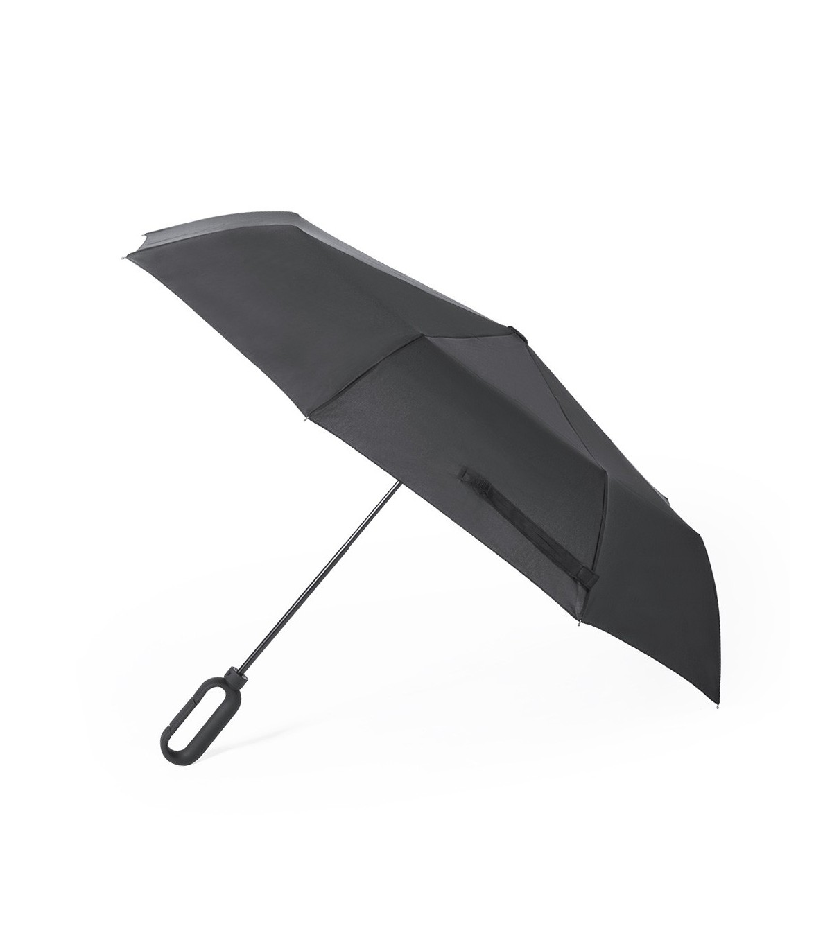 Paraguas plegable de 8 De 100cm de diámetro, con sistema antiviento Con varillas de fibra en color negro, cierre de velcro y mango con mosquetón de enganche.