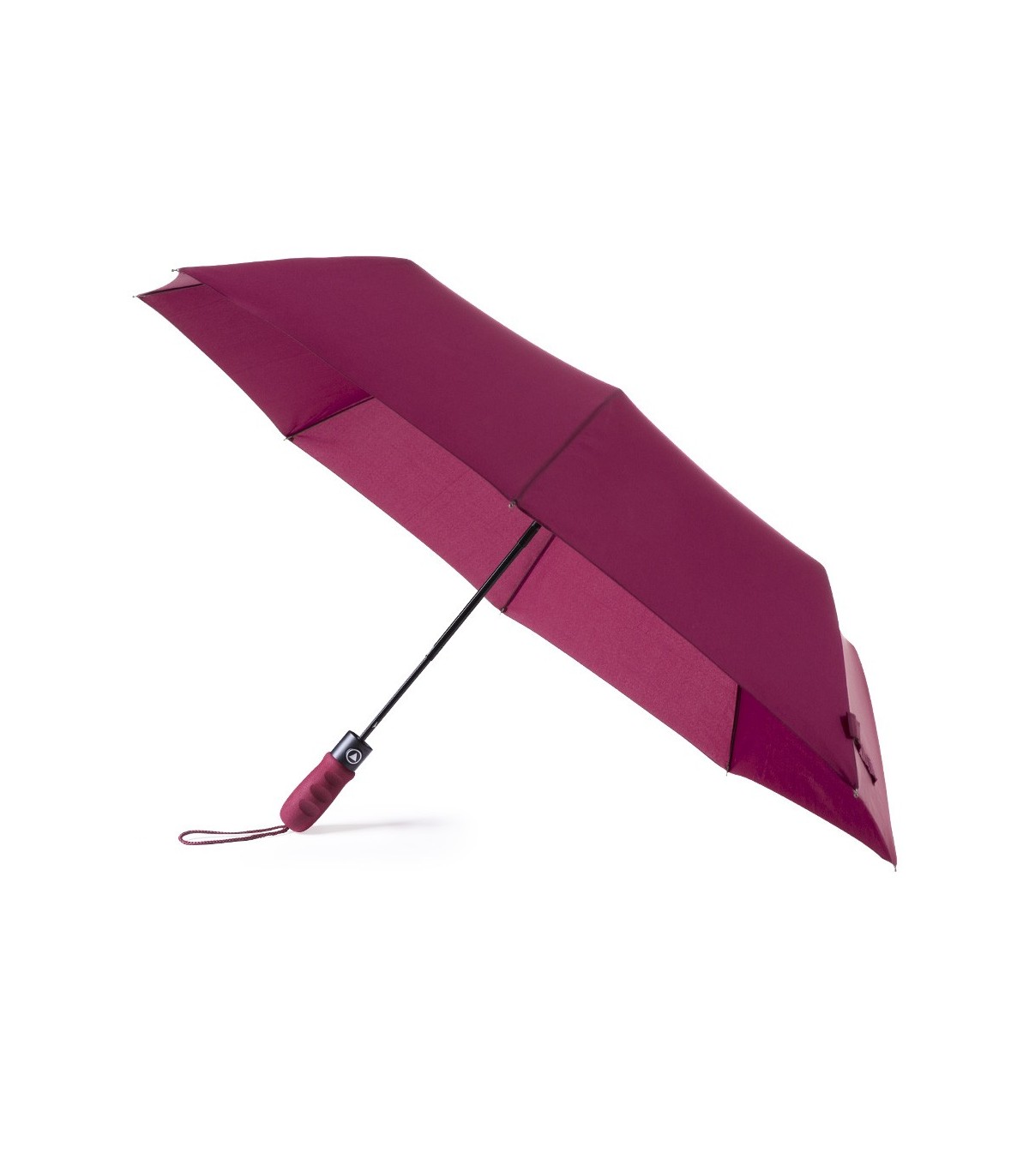 Paraguas plegable con apertura automática y en resistente material pongee. Con varillas metálicas en color negro, cierre de velcro y mango ergonómico de EVA.