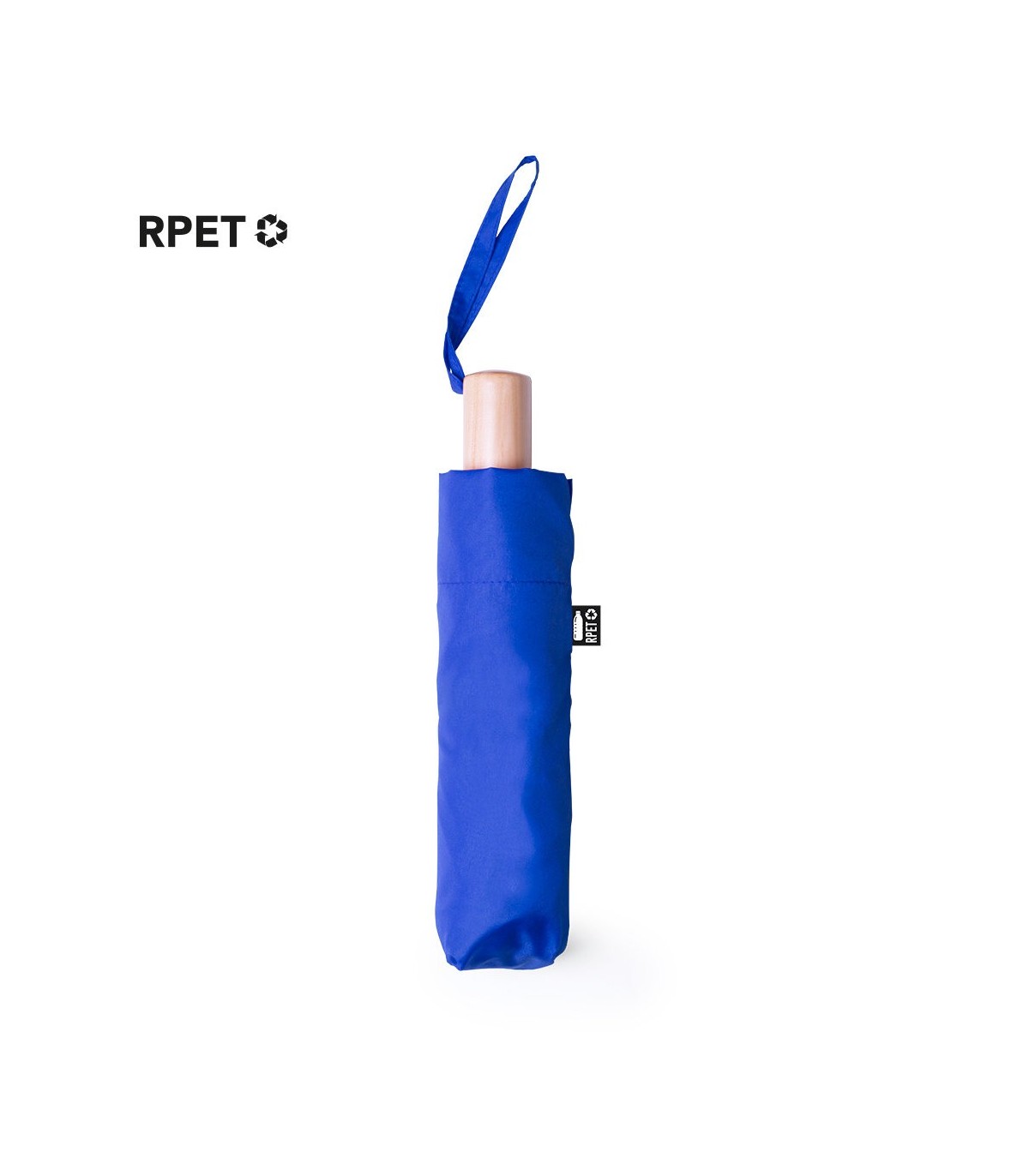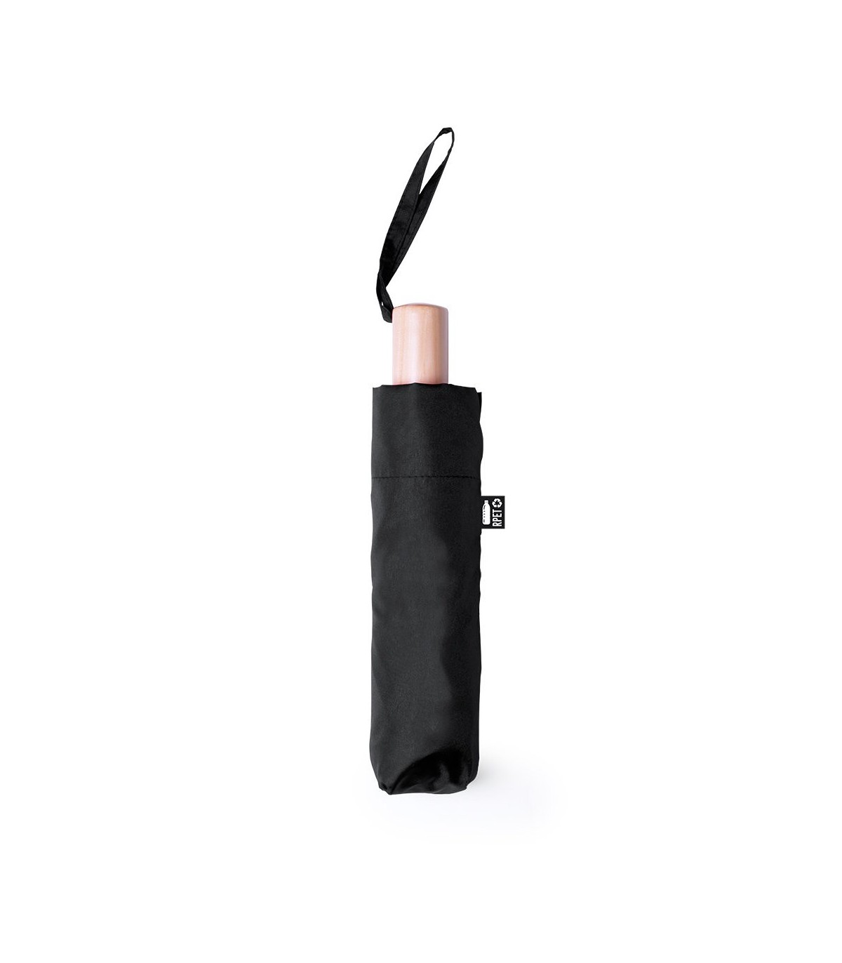 Paraguas plegable de 95cm de diámetro. En material pongee 190T RPET, De apertura manual, con sistema anti viento y varillas metálicas. Mango de madera, con funda de transporte y cintas a juego. Con etiqueta distintiva RPET.