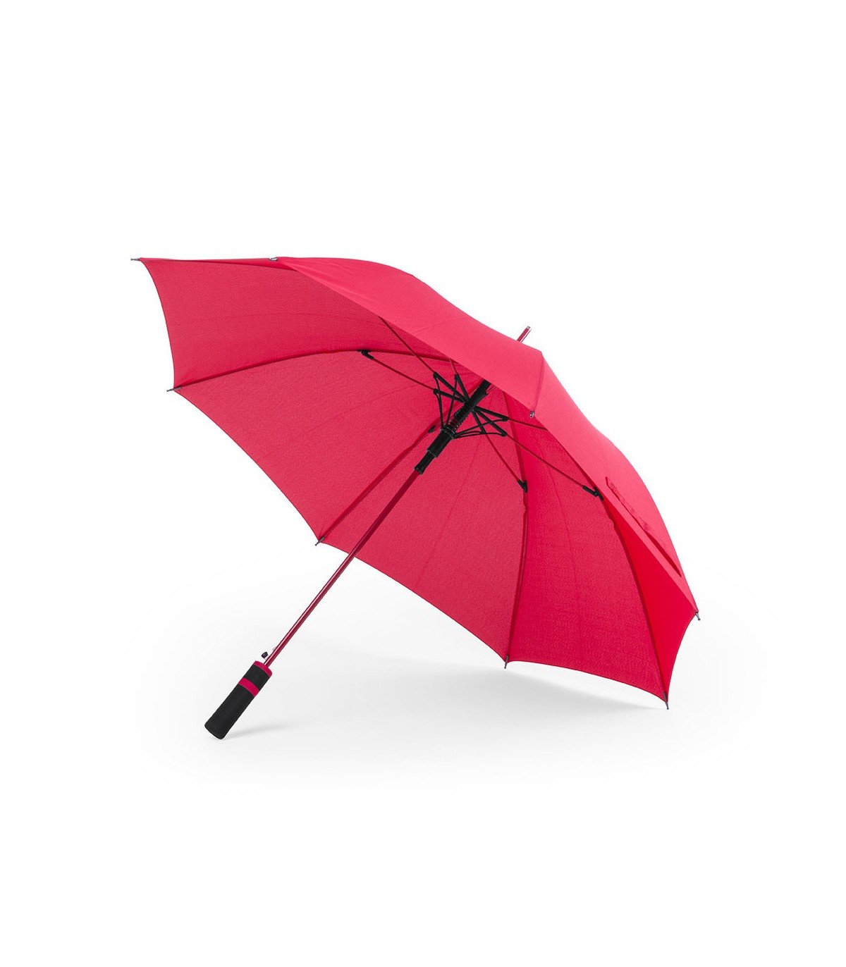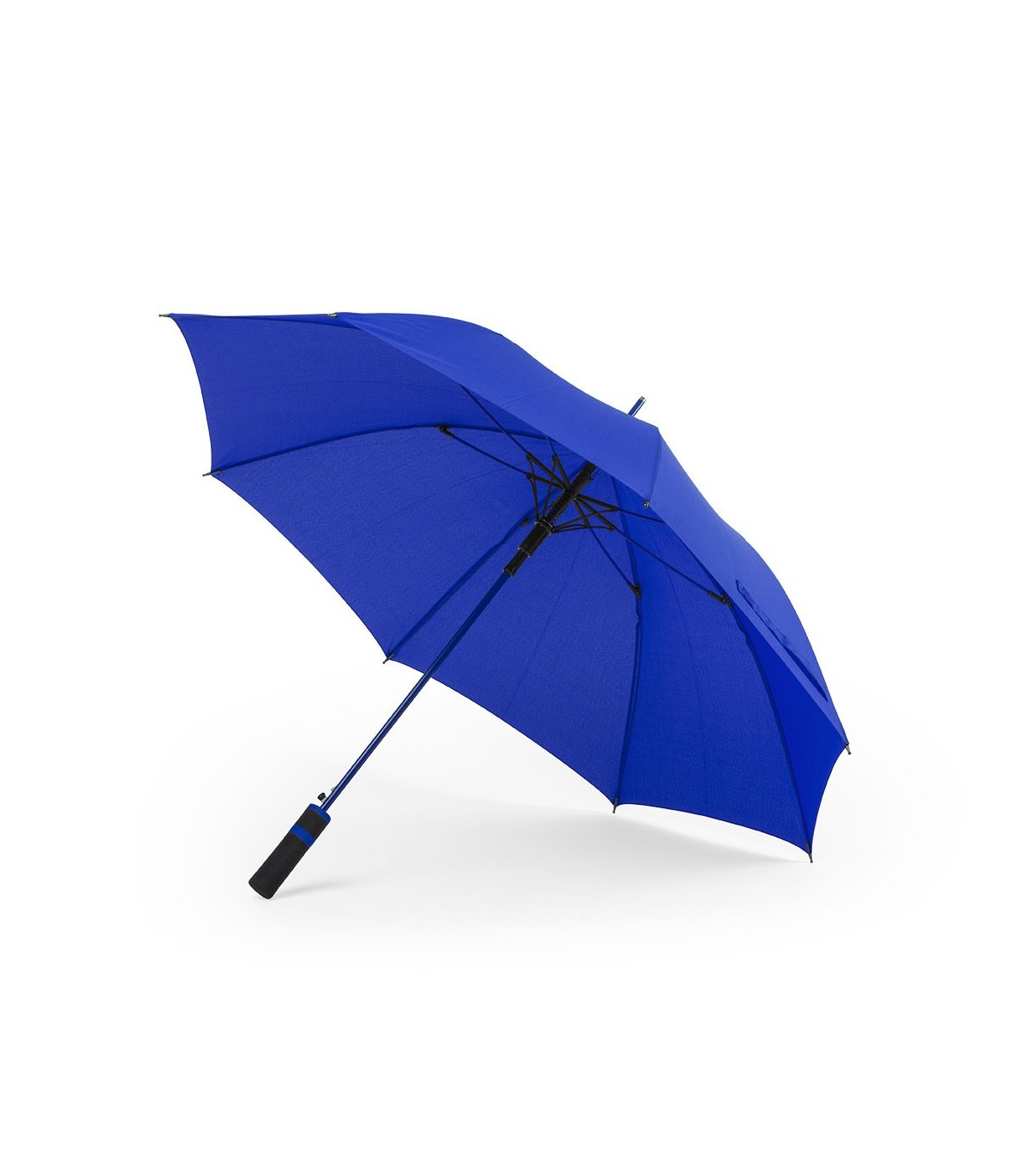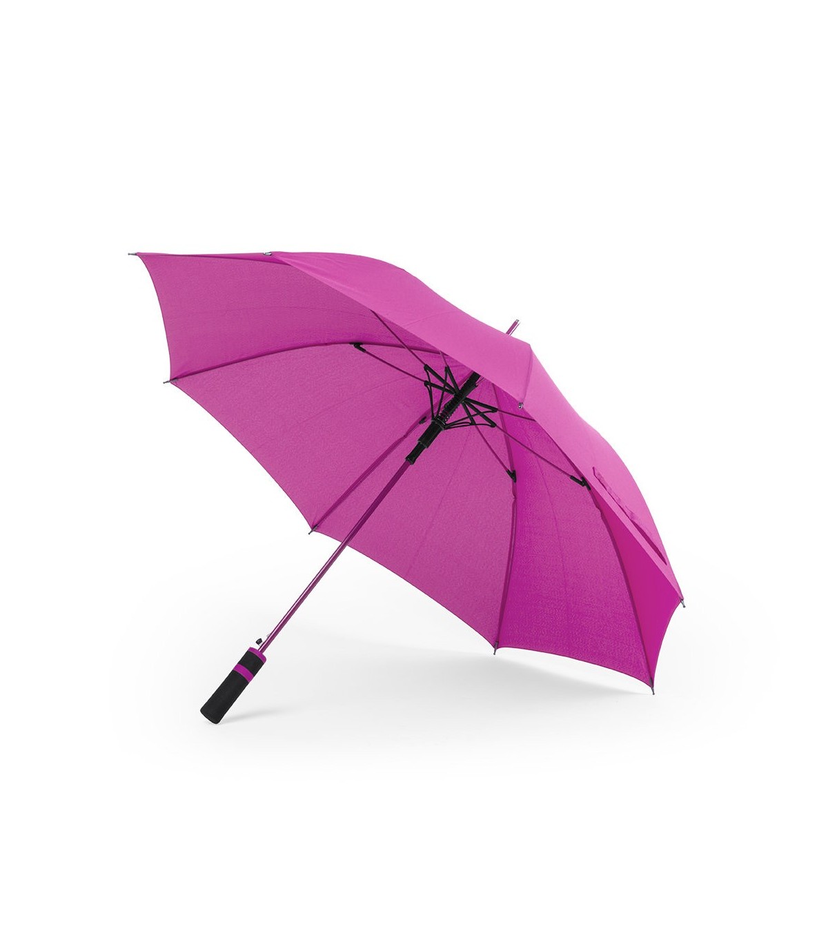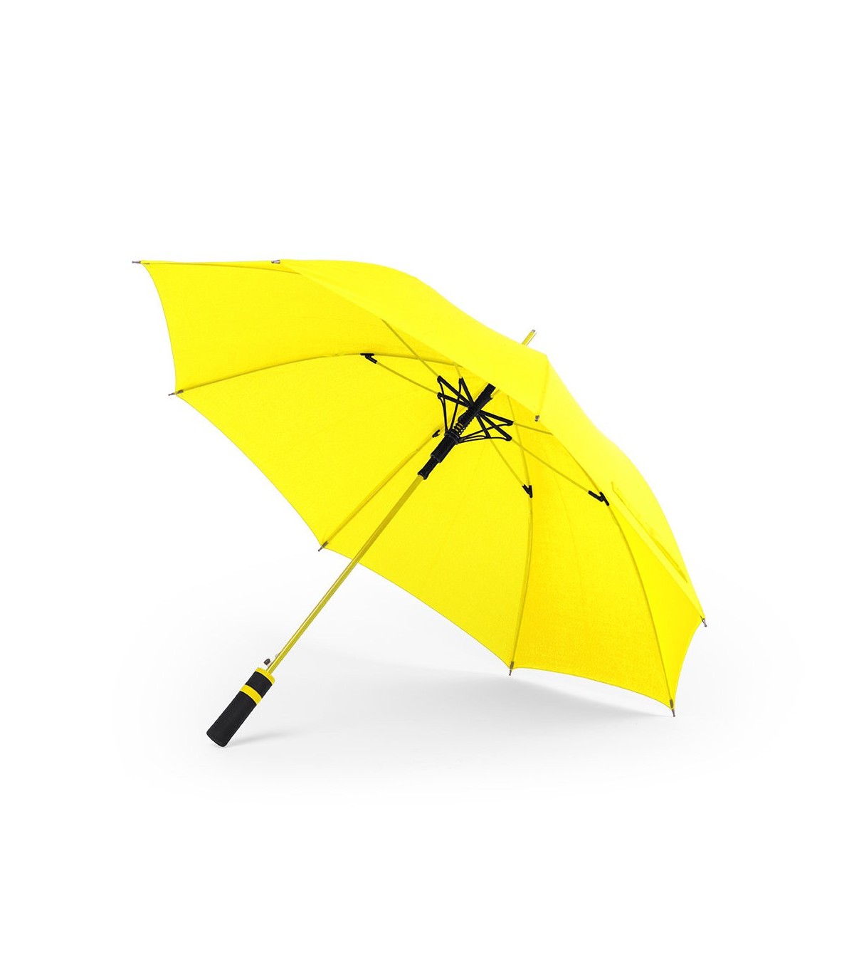 Paraguas de 8 paneles, en resistente material pongee con sistema antiviento y en vivos colores. Barra de apertura y varillas interiores a juego, con original mango de espuma bicolor. De 105 cm de diámetro, apertura automática, varillas de fibra y cierre de velcro.