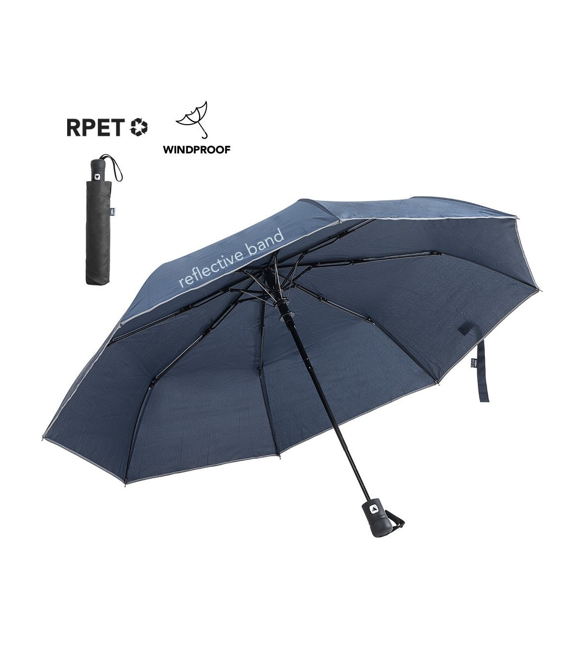 Paraguas plegable de fabricación ecológica de 100cm de diámetro. En material pongee 190T RPET, elaborado a partir de plástico reciclado, para así fomentar la reutilización de residuos plásticos y ayudar a la sostenibilidad del planeta. Con banda reflectante en todo el contorno del paraguas. De apertura automática, con mecanismo anti viento y varillas de fibra de vidrio. Mango con botón y distintivo RPET en etiqueta. Con funda RPET a juego.
