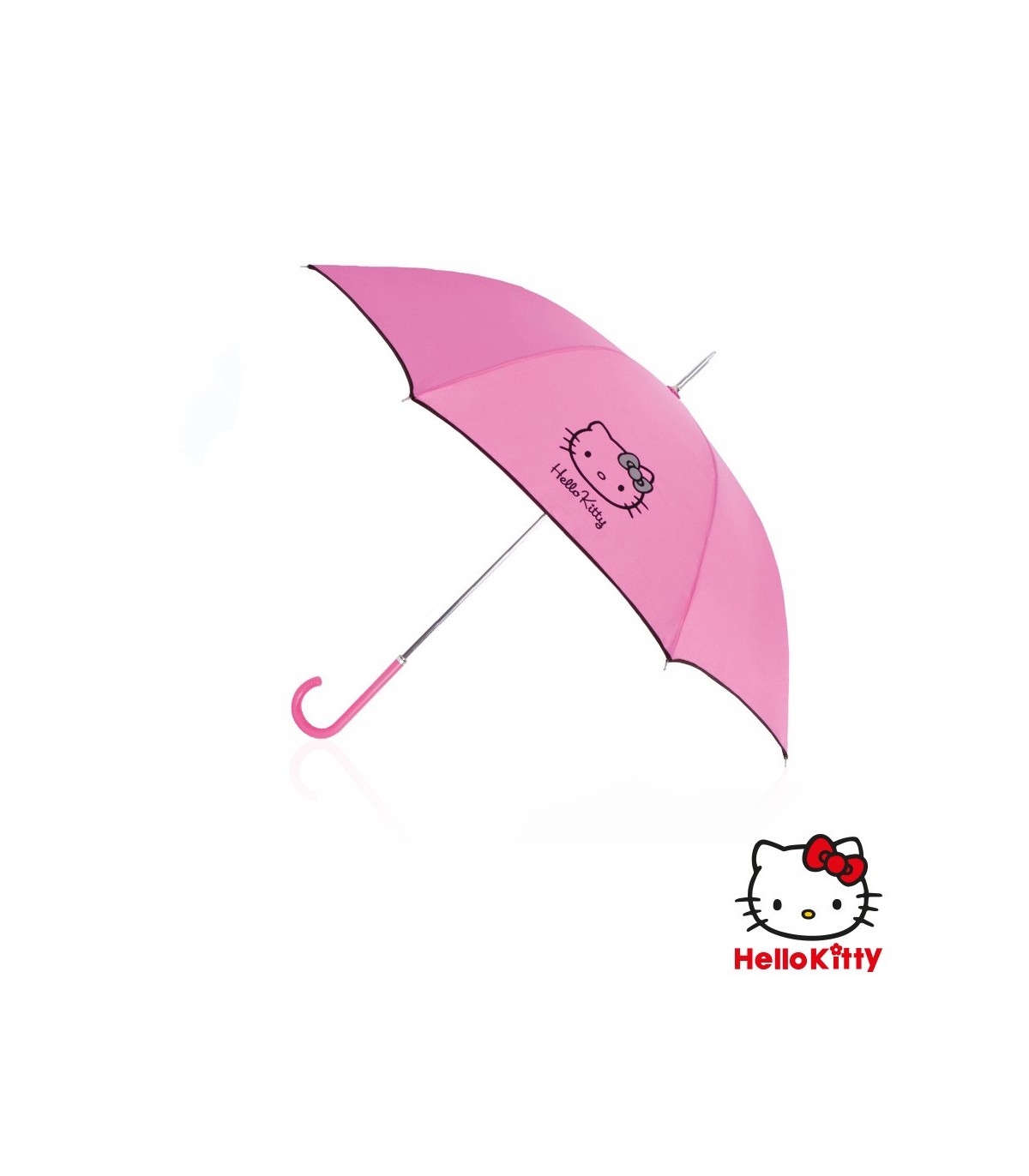 Paraguas de Hello Kitty de 8 paneles en divertido diseño rosa claro con gatita de la marca y 104cm de diámetro. De apertura automática, con varillas metálicas en color plateado, en resistente poliéster y con ribete de refuerzo en los paneles.