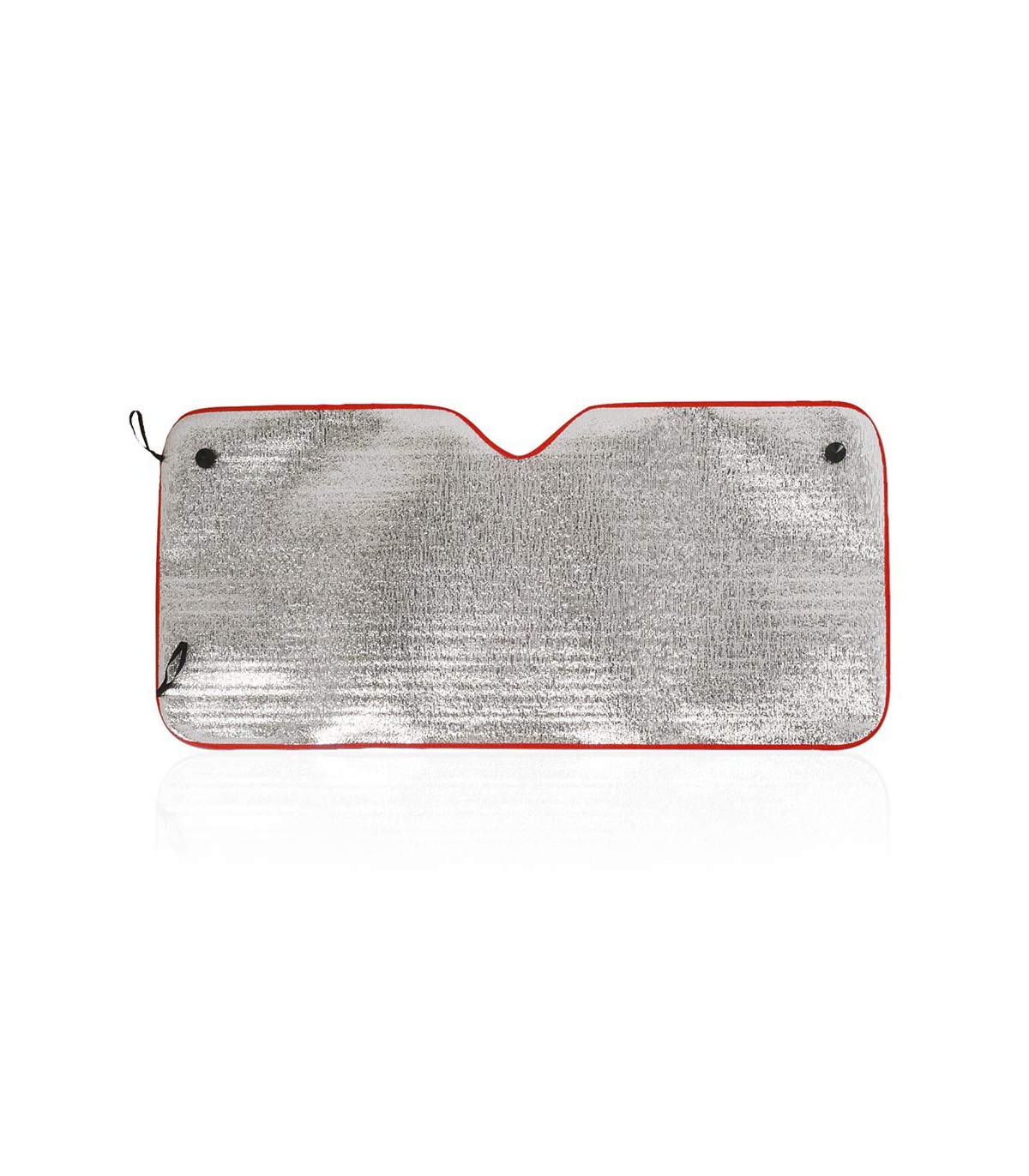 Parasol en aluminio a una cara en color plateado de acabado metalizado con ribetes de poliéster en diferentes colores muy originales y llamativos. De tamaño 130x60cm y espuma en el reverso. Cintas elásticas de ajuste con argollas metálicas de refuerzo, dos ventosas para ajuste en luna y presentación desplegado en plancha para fácil impresión.