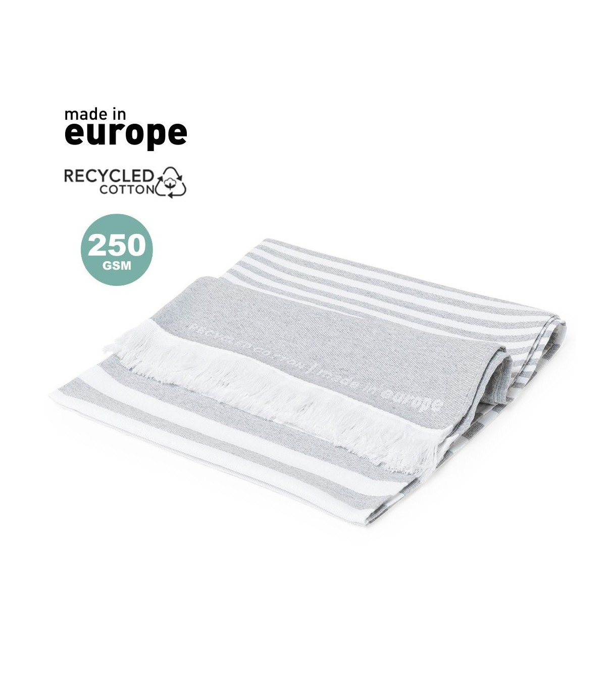 Pareo toalla 2 en 1 de línea nature y acabado gris. De fabricación europea y en combinación de algodón reciclado y poliéster de 250g/m2. Con certificación GRS (Global Recycled Standard / Estándar de Reciclaje Global) que acredita el origen reciclado del material usado en la fabricación del producto. Tamaño 150 x 80 cm.