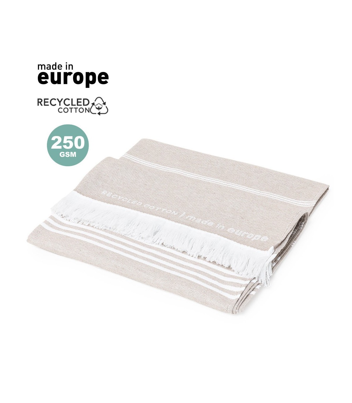 Pareo toalla 2 en 1 ecologicos en algodón reciclado y poliéster de 250g/m². Con certificación GRS (Global Recycled Standard / Estándar de Reciclaje Global).