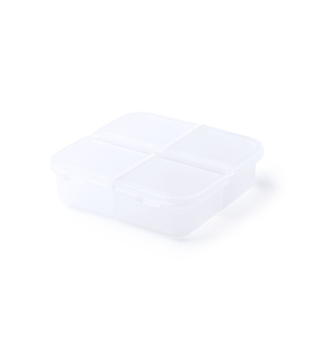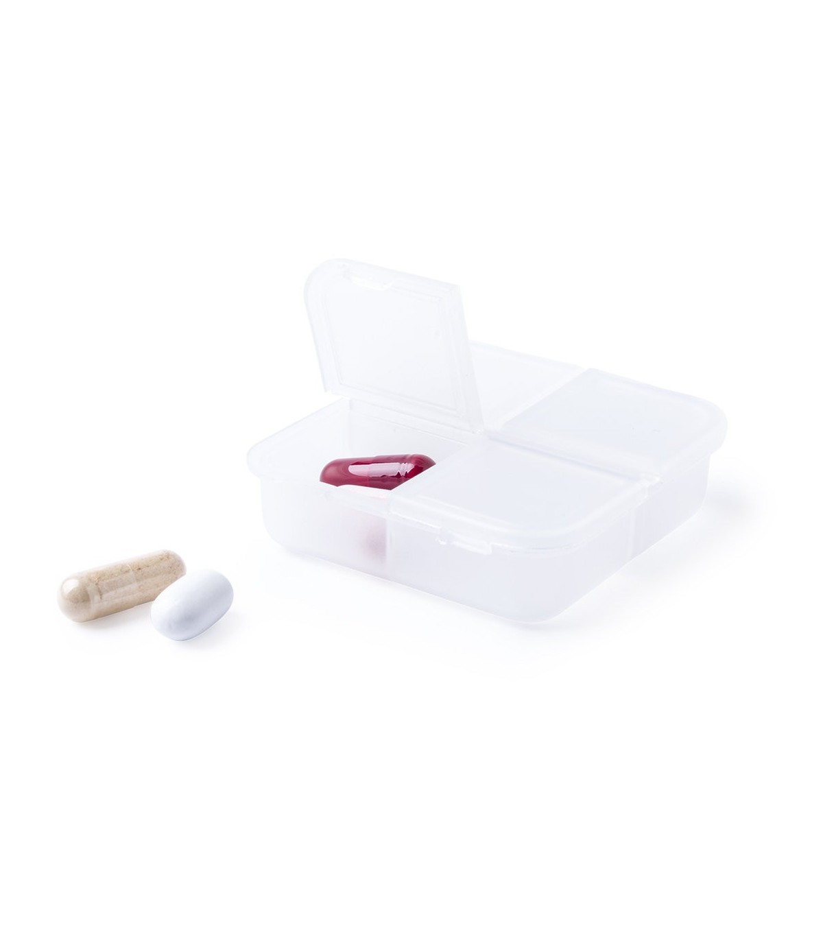 Pastilleros promocionales con 4 compartimentos en material ABS de acabado translúcido y libre de BPA. Con tapa individual por compartimento.
