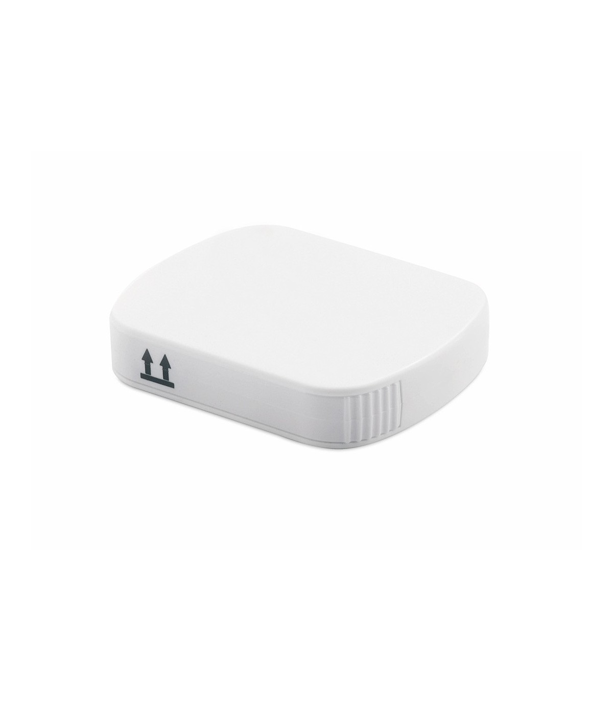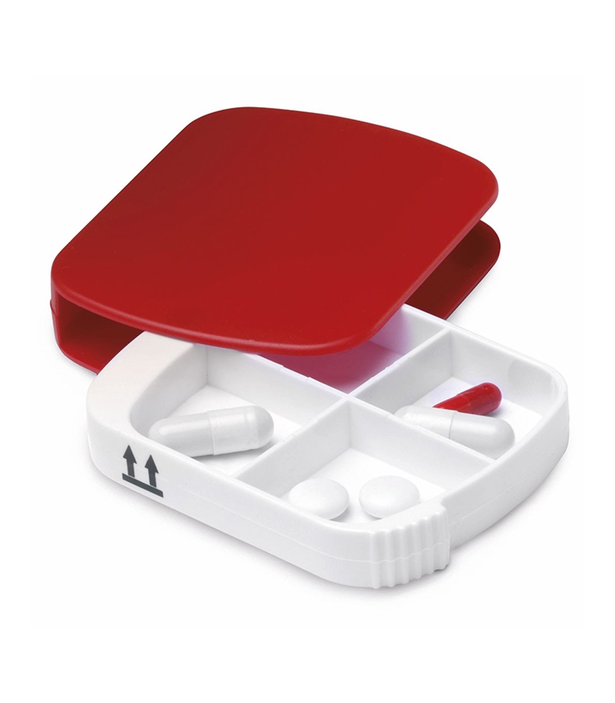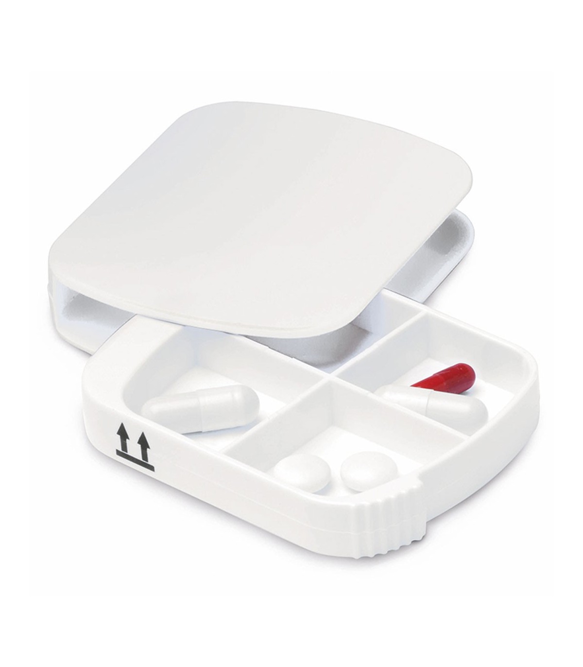 Práctico pastillero promocional con interior extraíble de 4 compartimentos y con indicador exterior para evitar caída accidental de las pastillas.
