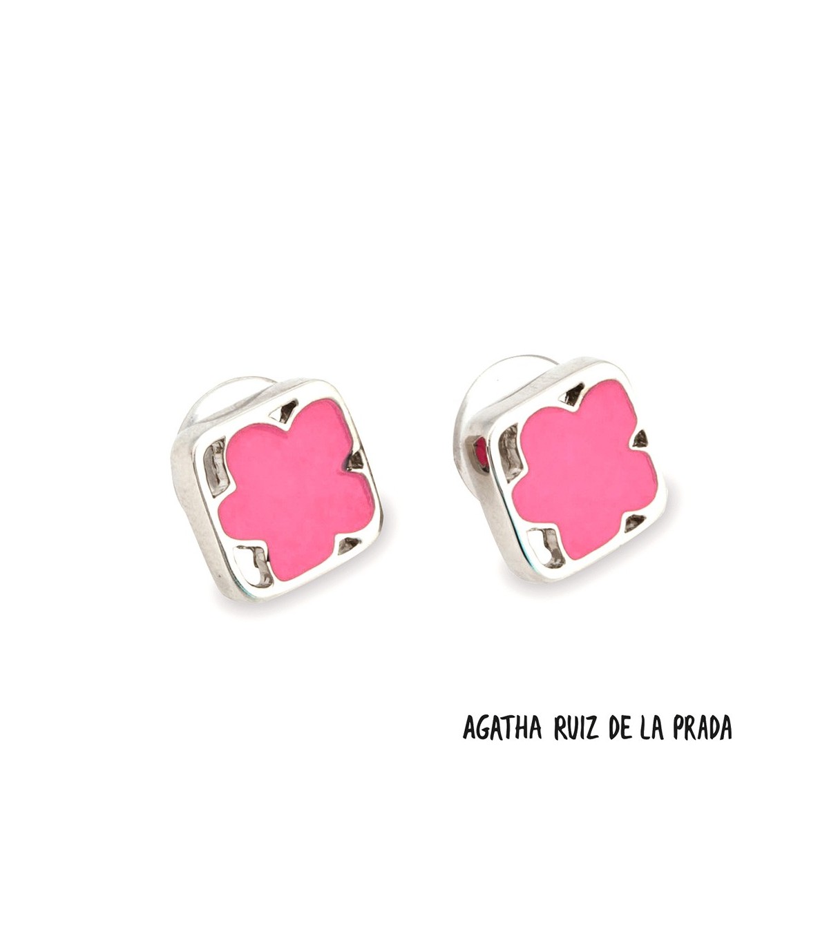 Pendientes de Ágatha Ruiz de la Prada en metal lacado con diseño de la marca esmaltado en color fucsia. Presentados en bolsita individual.