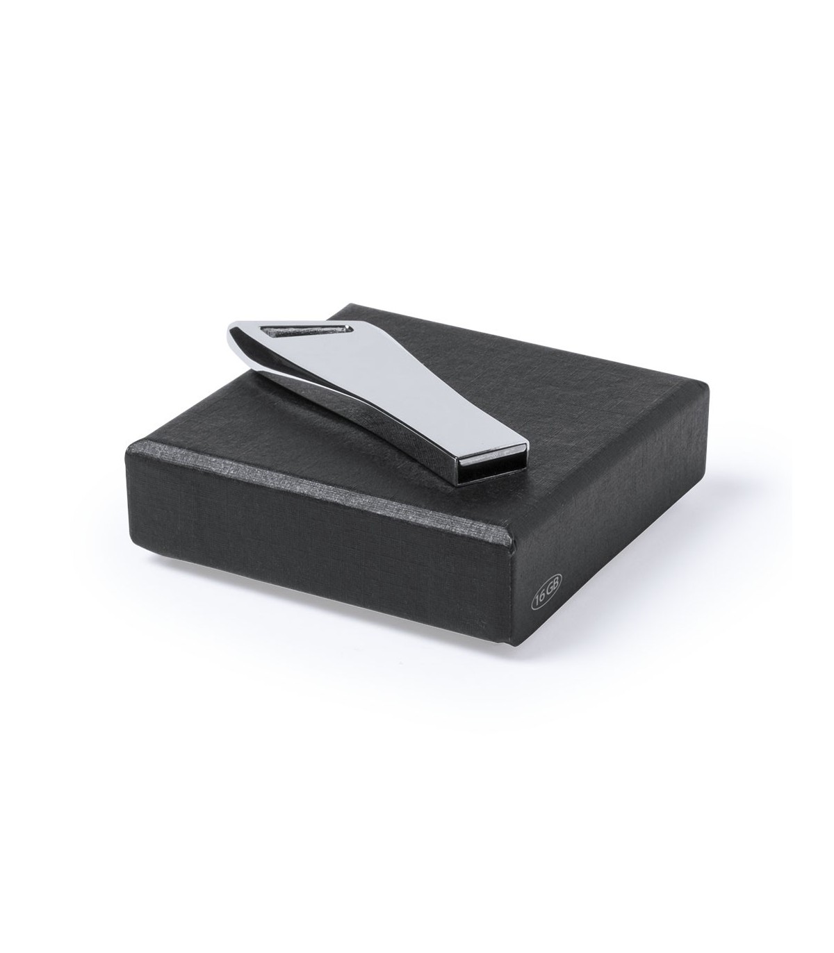 Memoria USB de 16GB de capacidad. De innovador diseño, en acabado metálico brillante e idónea para llevar en el llavero. Presentada en elegante estuche individual de cartón y suave espuma troquelada.