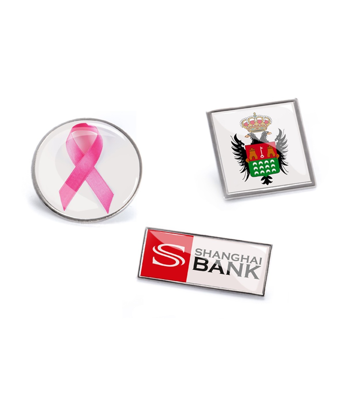 Pin metálico 100% personalizables especialmente diseñado para regalos publicitarios con logo, Impresión a todo color incluida y doming incluido.