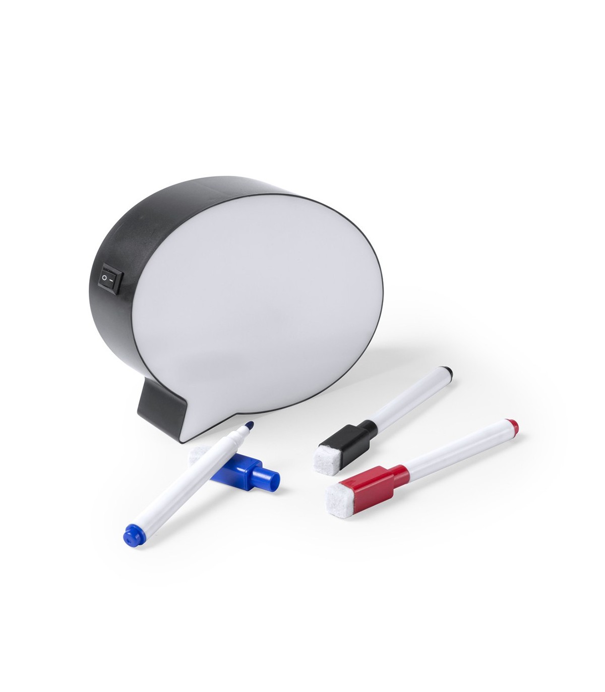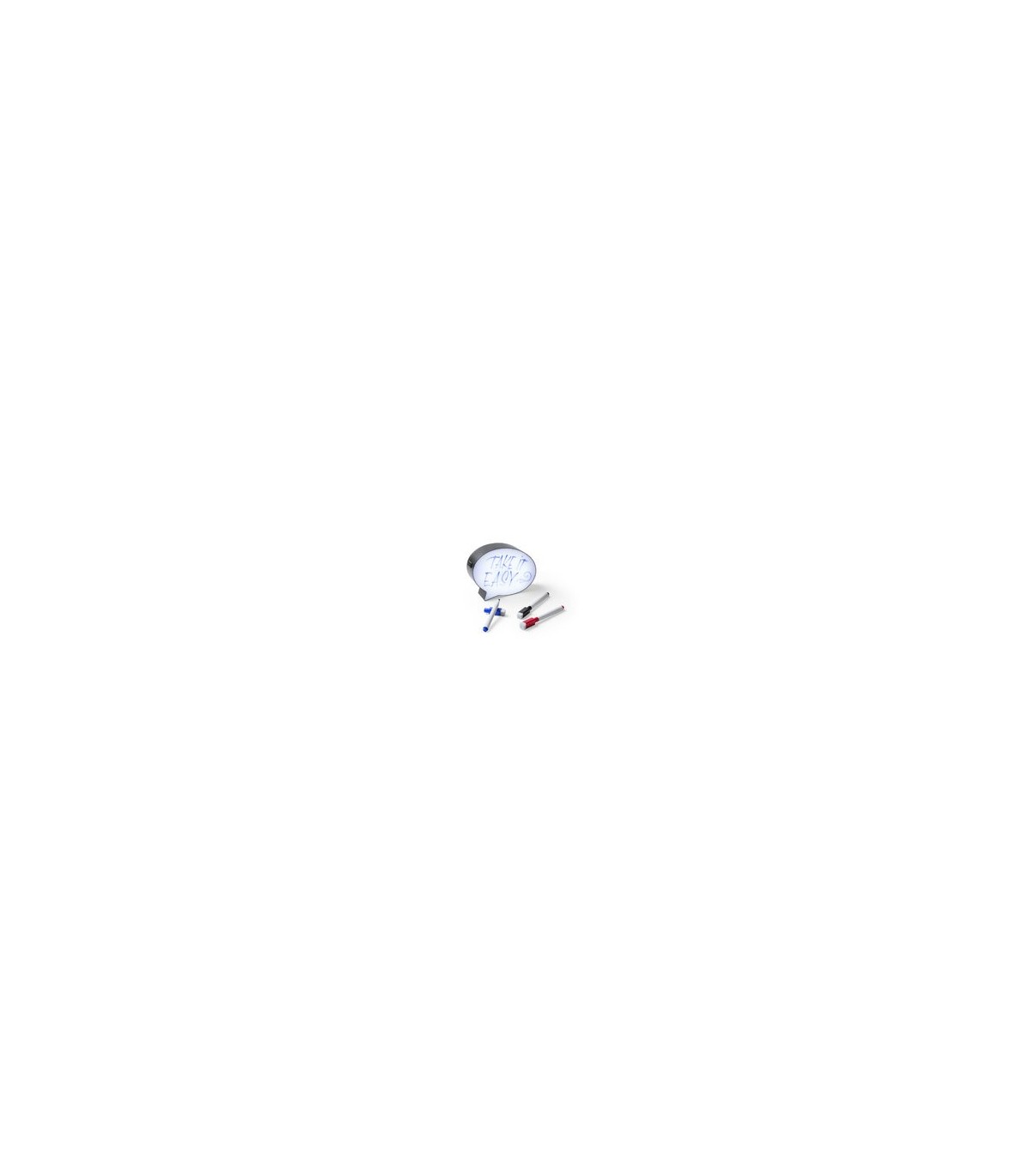 Pizarras tipo bocadillo con interior iluminado por 8 ledes. Con botón ON/OFF y tres rotuladores con borrador en colores azul, negro y rojo incluidos. Alimentación a pilas: 3xAAA no incluidas.
