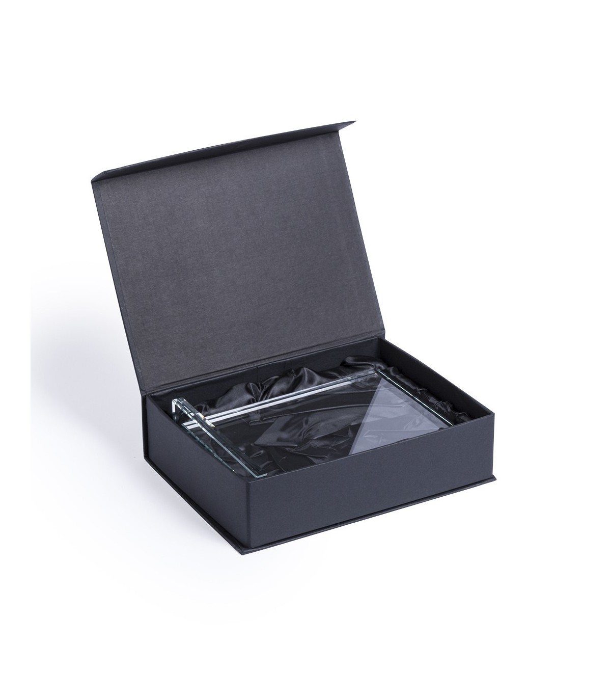 Placa trofeo de grueso cristal con elegante diseño rectangular y resistente base. Especialmente diseñada para marcaje a láser y presentada en estuche de protección individual.